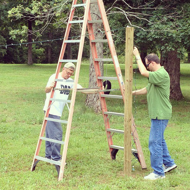 | Madeline & Audley hanging up swirly, twirly decorations from the ceiling. |