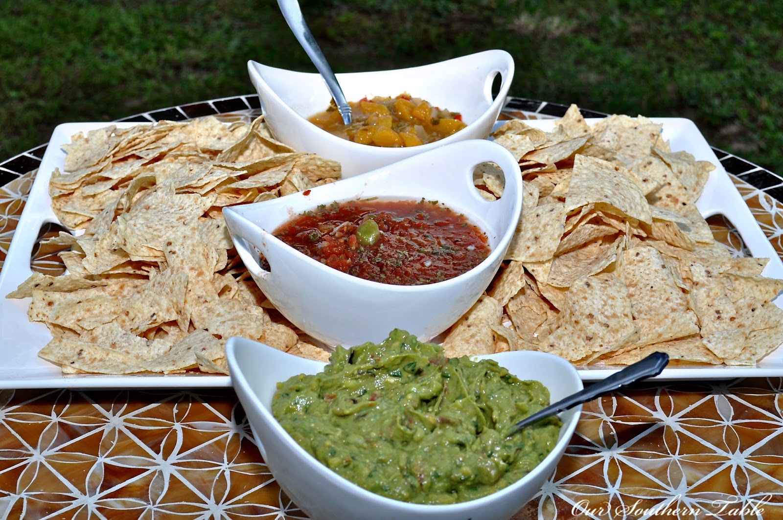 Momma made baked beans and I made homemade guacamole, peach salsa and tomato salsa.