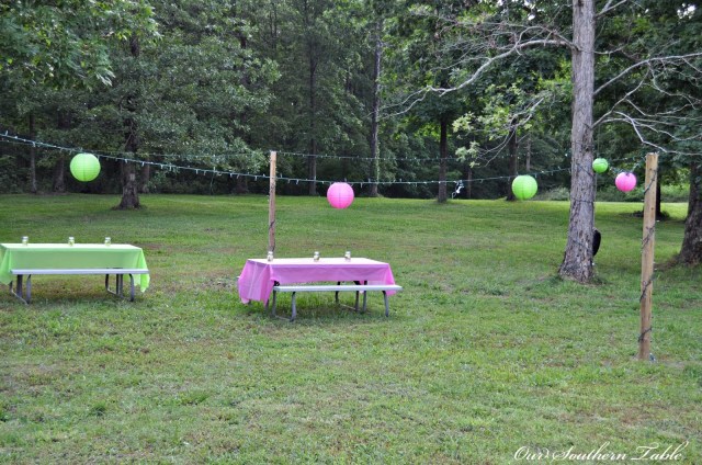 To help keep things simple and stay within our budget I planned both parties to have the same color scheme (pink & green), which saved a lot on decorations. We also utilized much of what we already had including serving pieces, tea-light candles, diamonds, christmas lights and scrap lumber from my parents little farmette.
