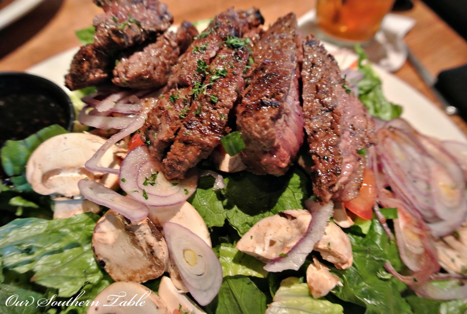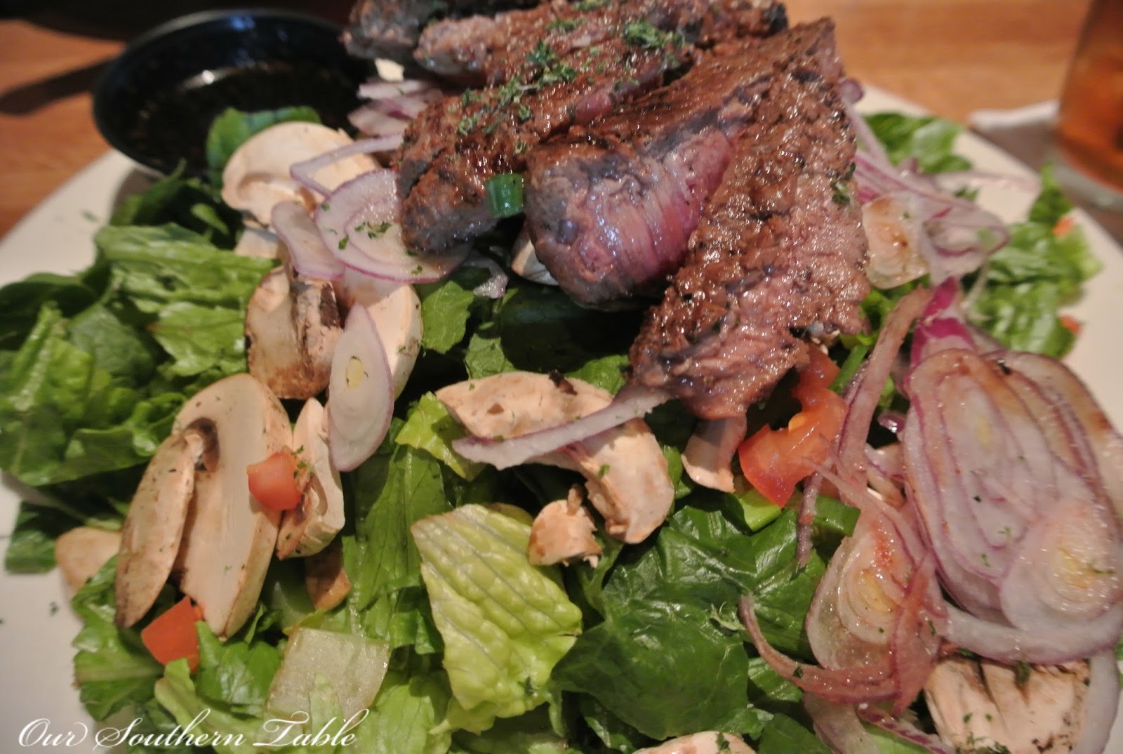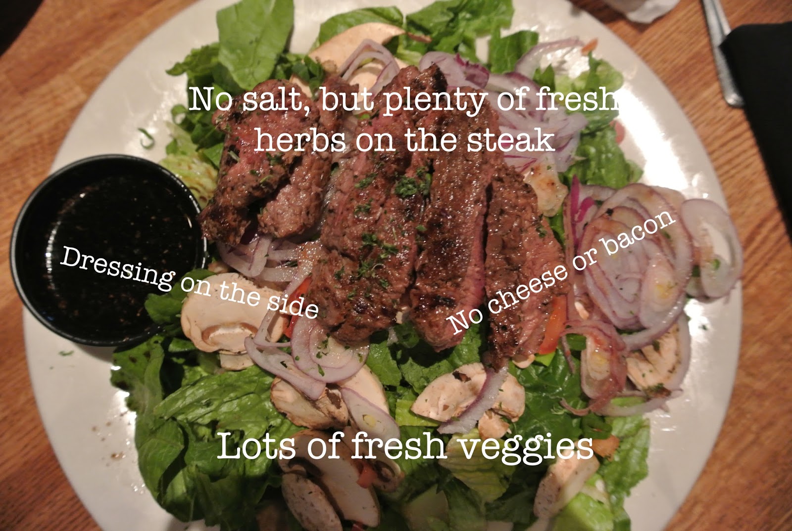Five ounces of lean sirloin grilled to my liking without the high sodium content on a bed of lettuce, mushrooms, tomato, & green & red onion.