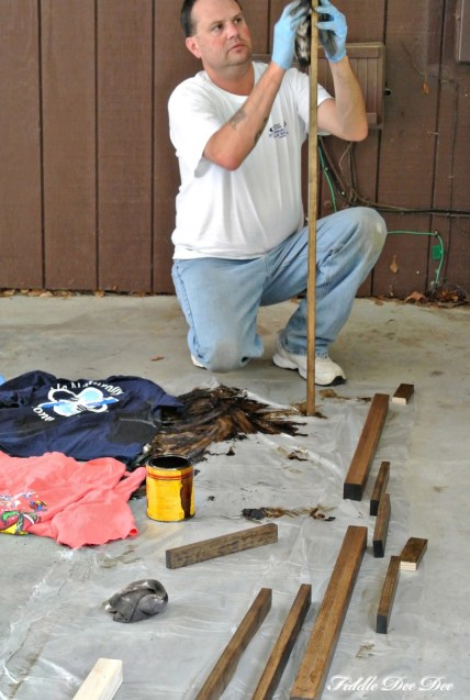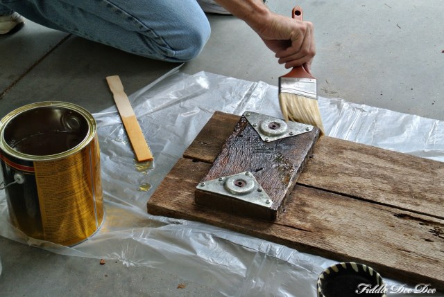 We bleached the barn door and let it sit for a few weeks to kill anything that had decided to bury itself in the wood. On the door itself, we did not stain it, but instead applied several coats of polyurethane. I loved the richness of the wood when it dried.