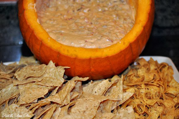 Combine the first five ingredients and shape into a cone for the top of the witches hat (or a pumpkin even … it’s very versatile) leaving enough of the mixture to create the round base as well.  Gently roll the top in blue tortilla chips, leaving the bottom uncovered so that you can dip it in the crushed corn chips that will make the band of the hat.