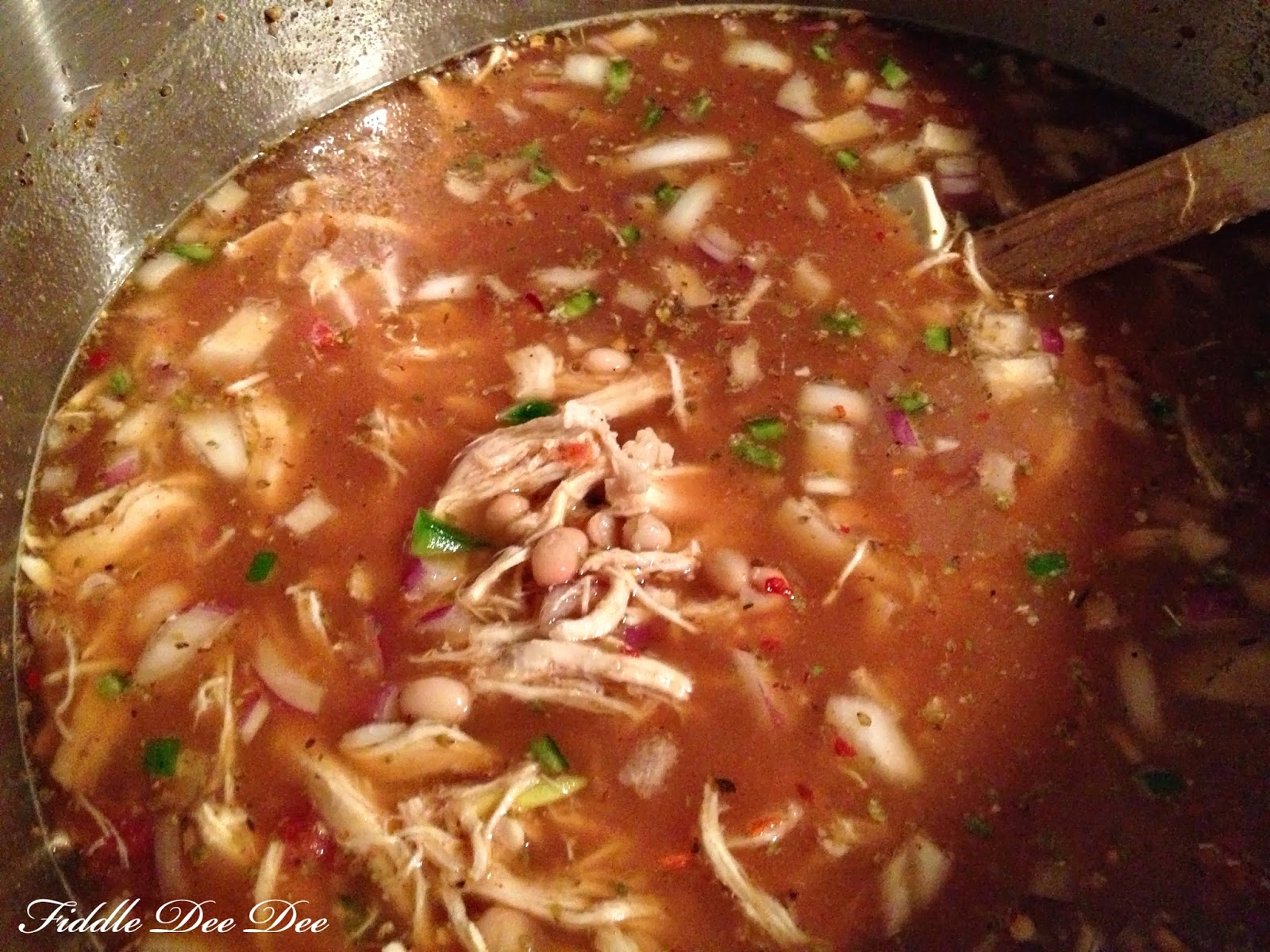 Combine the beans, broth, bell pepper, red onion, spices, garlic & tomatoes in the soup pan. Simmer on medium about an hour. If the liquid seems to be cooking down, add some of the broth that was made when you cooked your chicken earlier.