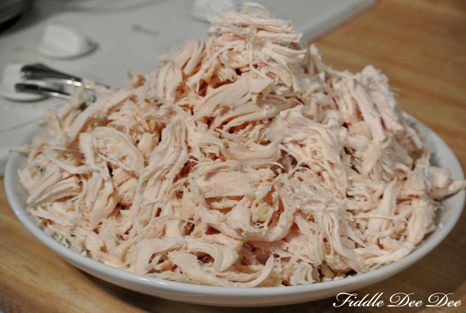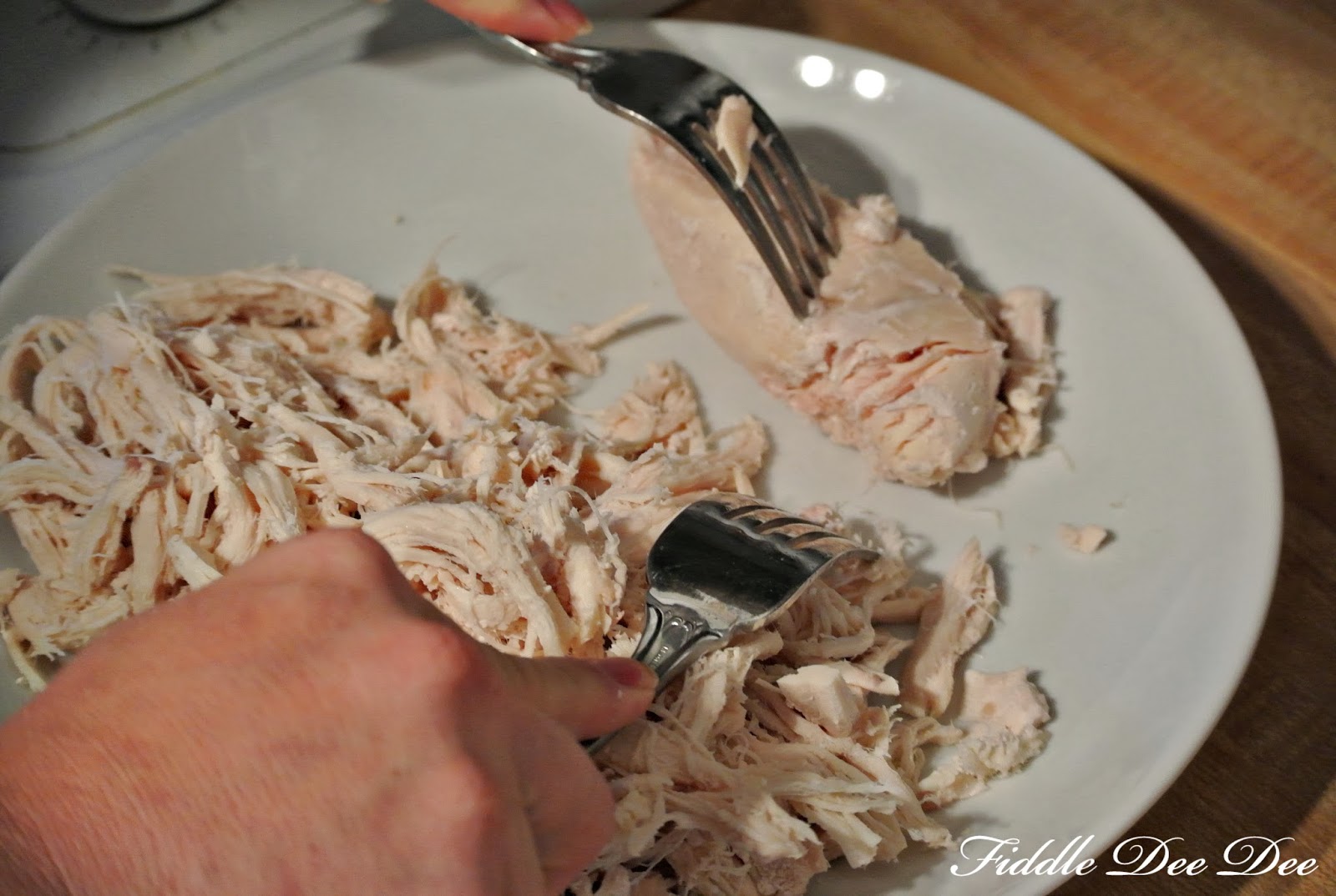 Cover your chicken with water and boil until it is done all the way through ( I add a little garlic to mine). Remove from the water and shred, using two forks. Save the water in which you cooked the chicken.