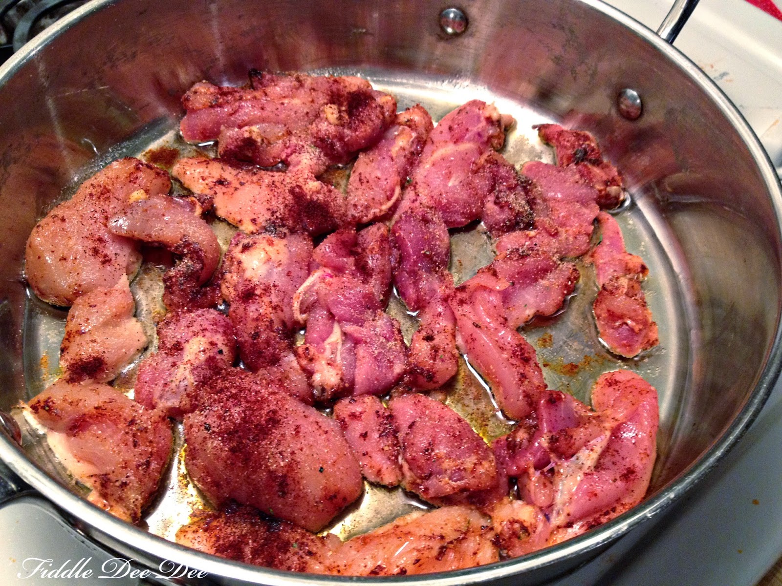 *In a large pan, heat your olive or coconut oil, then add a layer of the chicken.  Sauté’, on medium heat until the chicken is done, turning once while cooking.