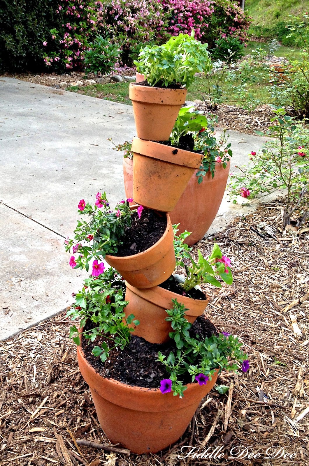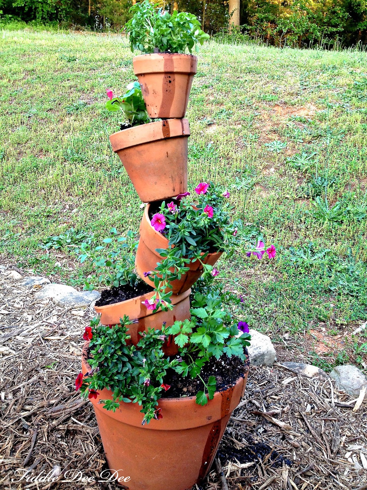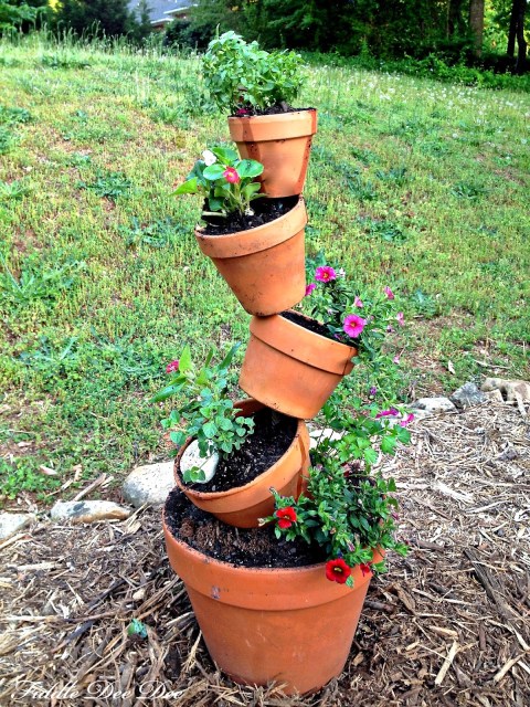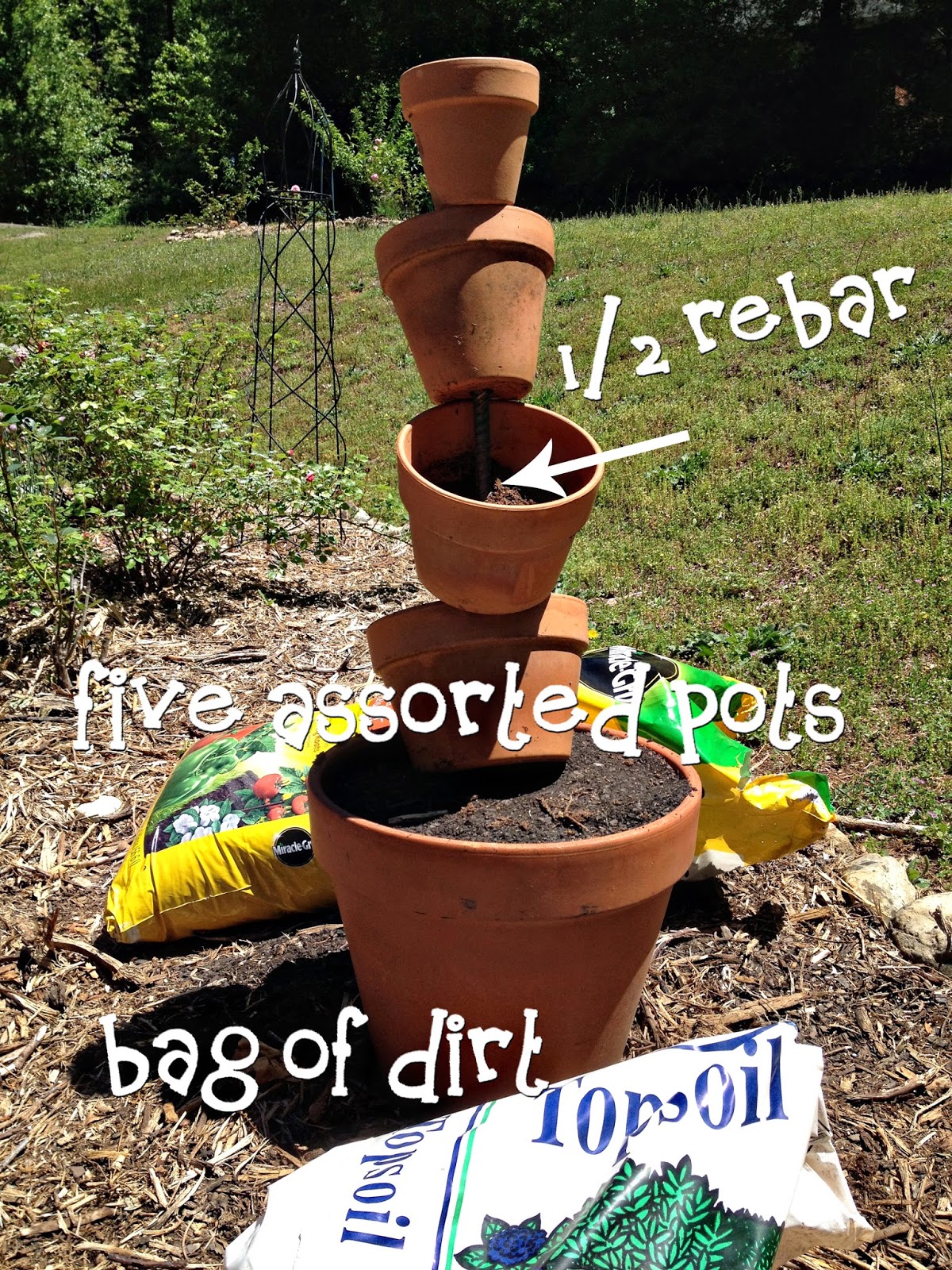 To create this simple planter all you need are five terra cotta pots of various sizes (large to small), 1/2 inch (or #4) rebar, potting soil and plants.