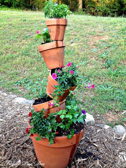 We have four more flower pots, so my plans are to pick up one more and another piece of rebar for a second topsy turvey planter.  I really like the idea of having my herbs right out my back door for easy access.  I’ll post pictures of the two planters in the whole scheme of things to show off our patio color when I get it finished!