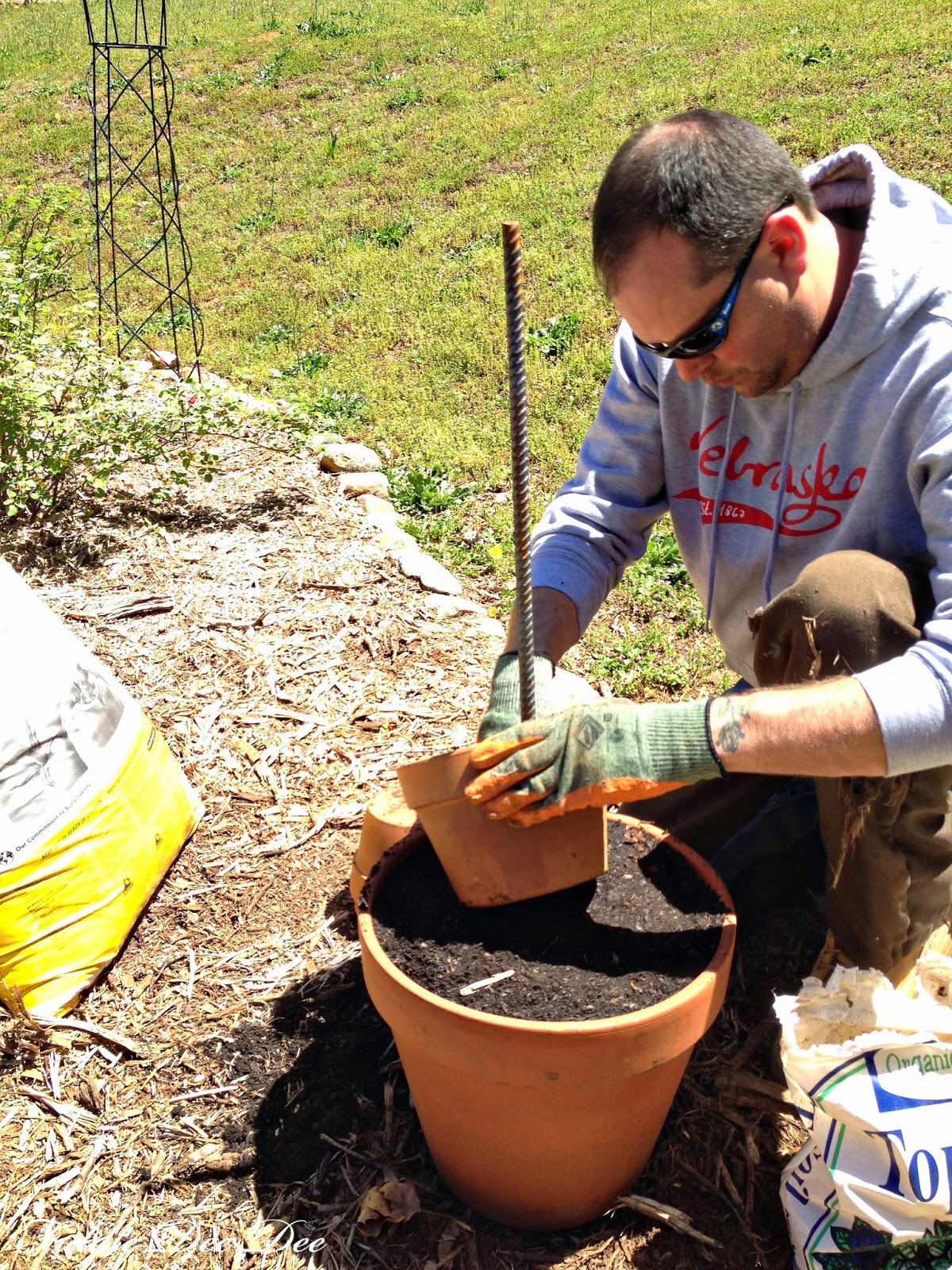 3.  Center your rebar in the largest pot.  Have someone hold it centered as you fill that pot completely with dirt.  This will make the base for your second flower pot.