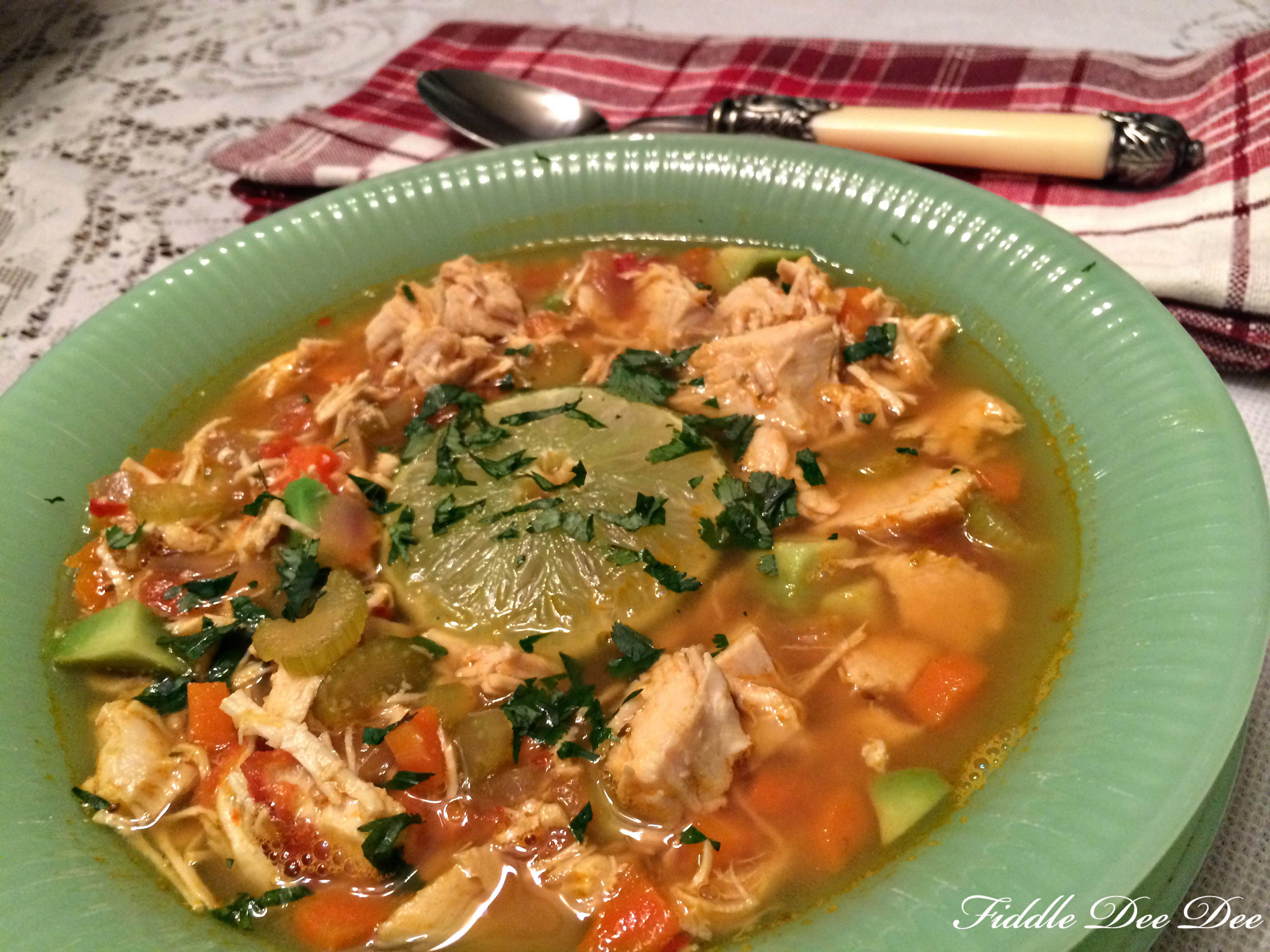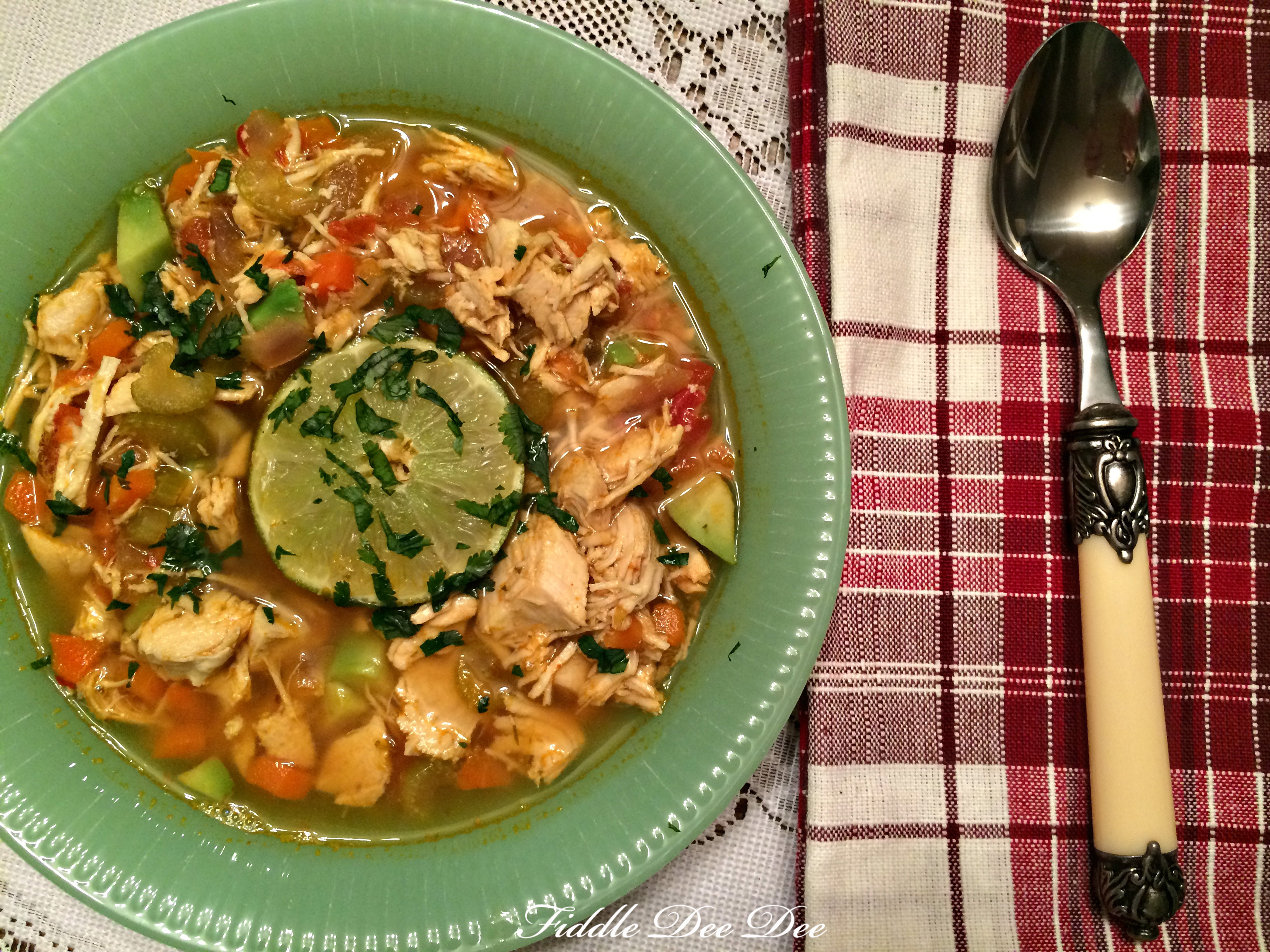 Since our taste buds seem to lose their power when colds take over I opted out of traditional chicken noodle soup (which is one of our favorites), and decided to get a little creative with a spicy southwestern flavored chicken soup for our supper last night.
