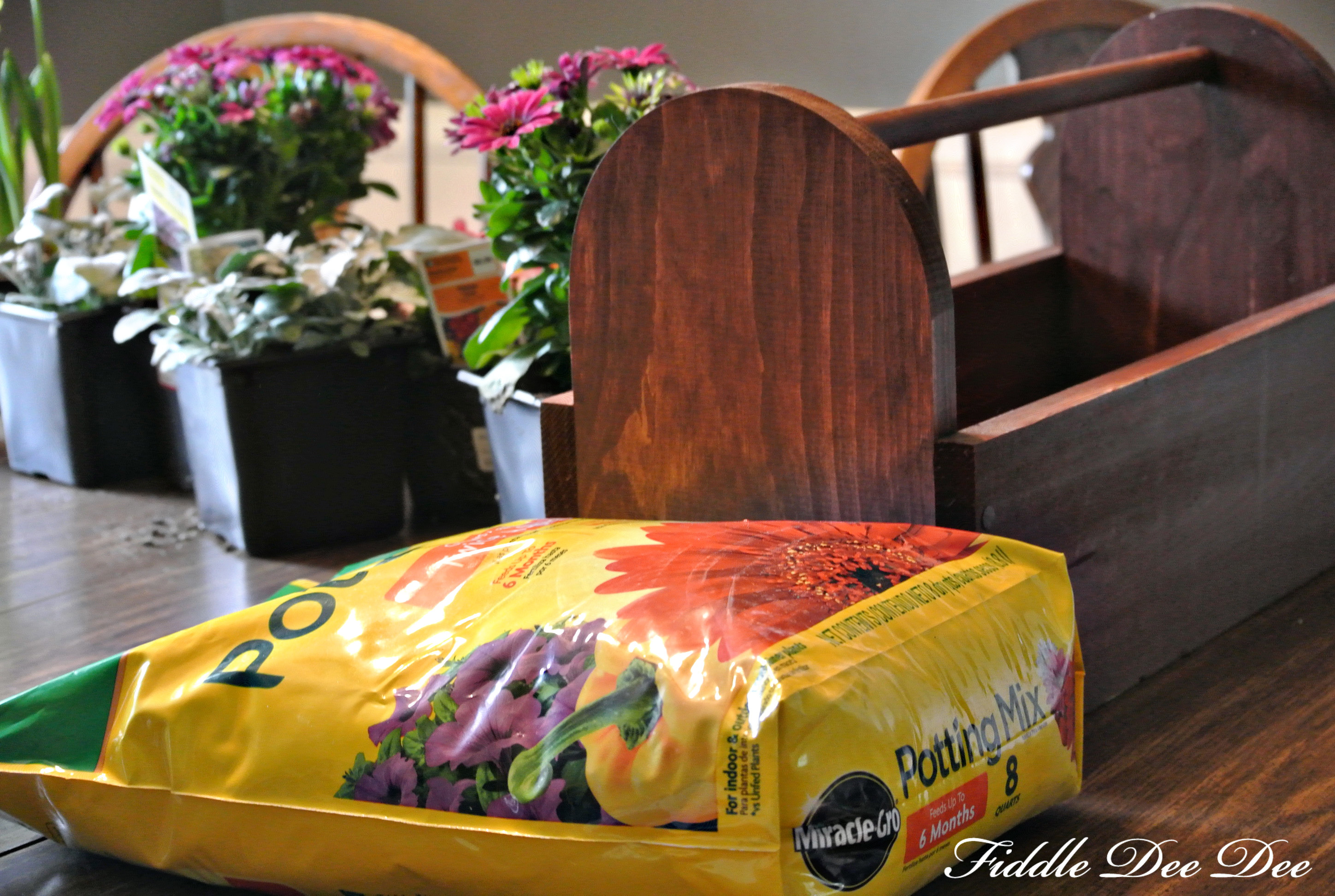 I removed the plants from their pots and broke up the compacted dirt and roots from their bases before planting them in the little tool caddy.