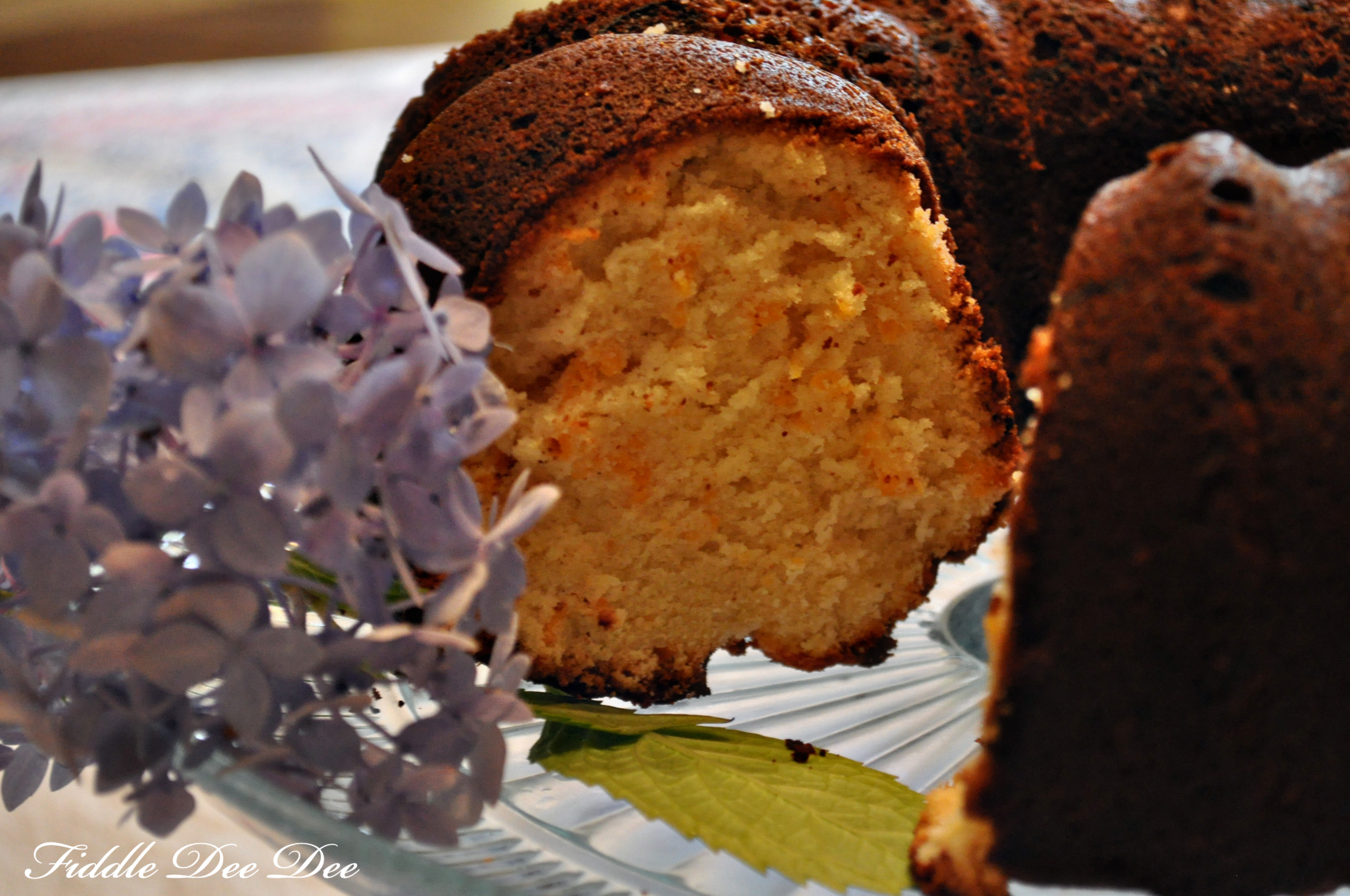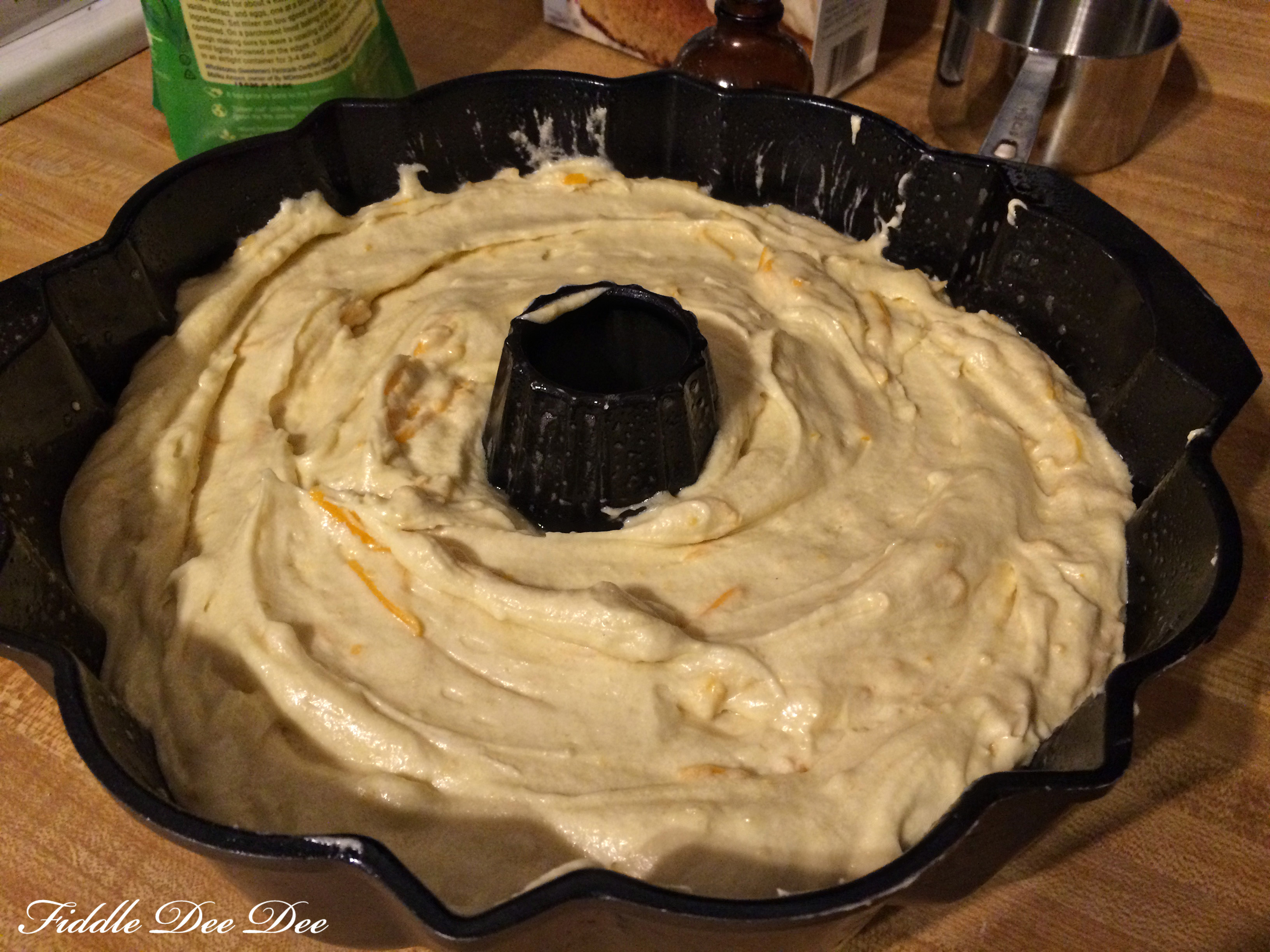 3. Pour into greased and floured 10-inch bundt pan. Bake a 375 for an hour and fifteen minutes or until a wooden pick comes out clean.