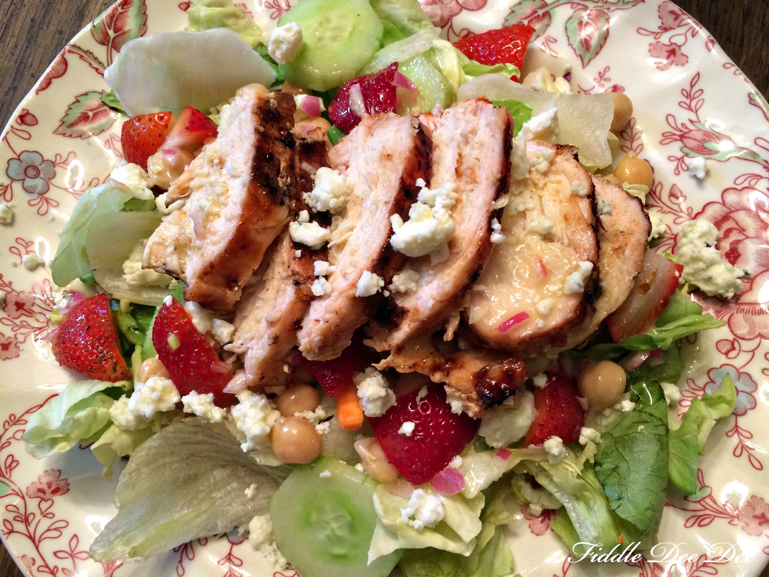 A salad of fresh greens topped with 4 ounces grilled chicken breast, fresh strawberries, chick peas, a little blue cheese and a balsamic-dijon vinaigrette.