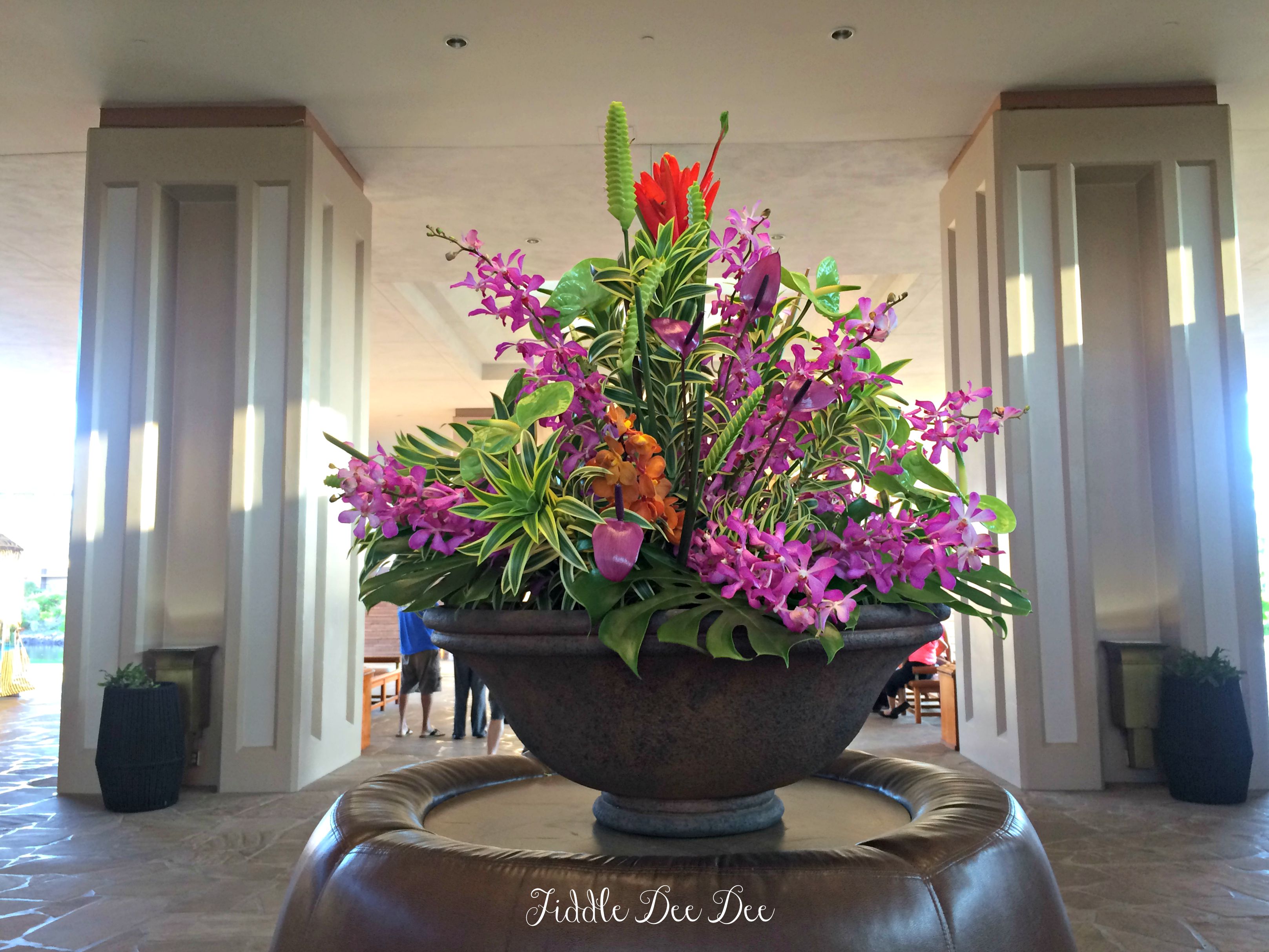 We arrived late in day for our stay on the Big Island. We were tired after a day of sightseeing on Oahu and then flying Hawaiian Air over to the Island. Walking into the open lobby was so lovely. Fresh flower arrangements brimming with native flowers were a delight for the eyes.