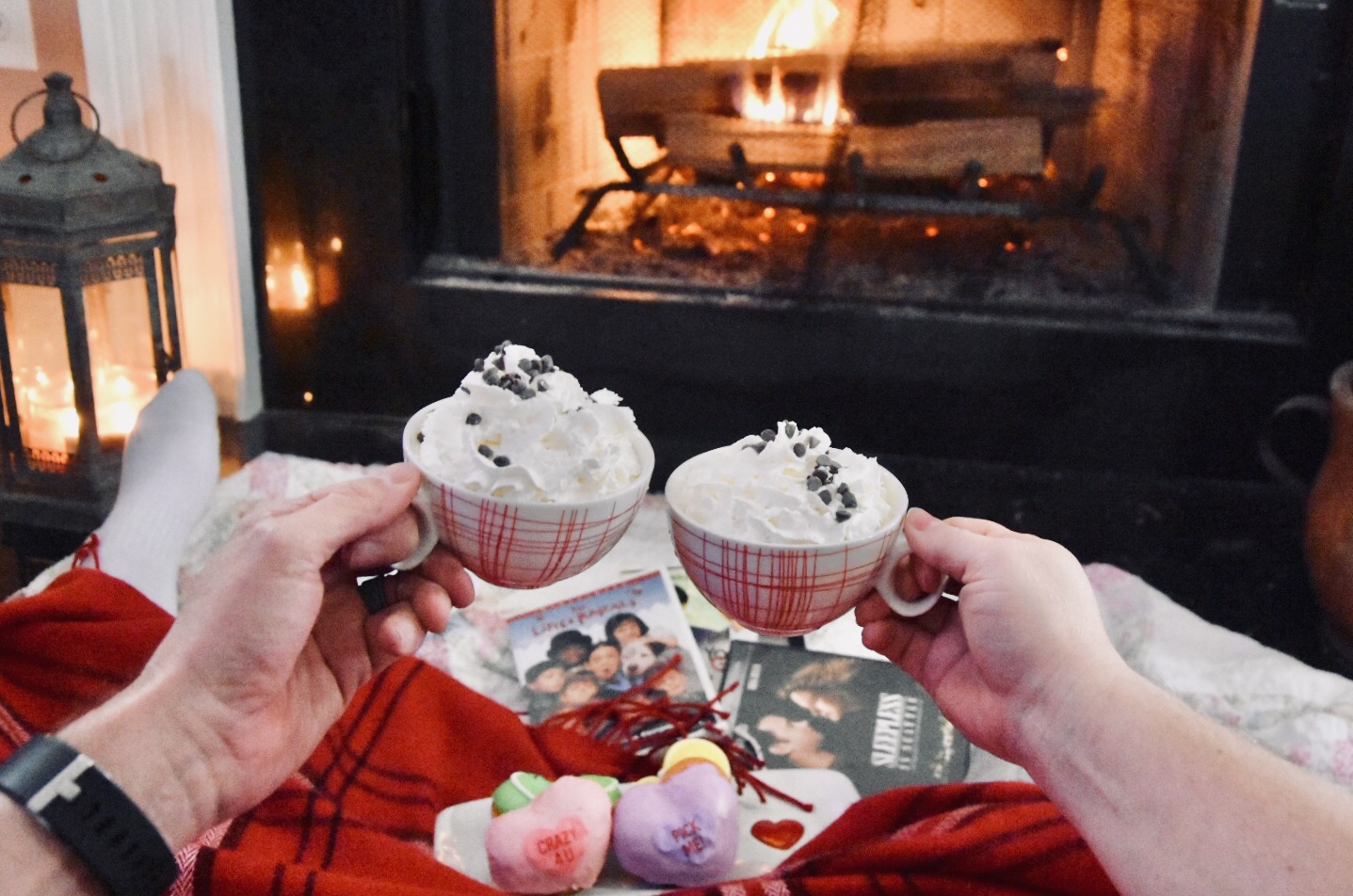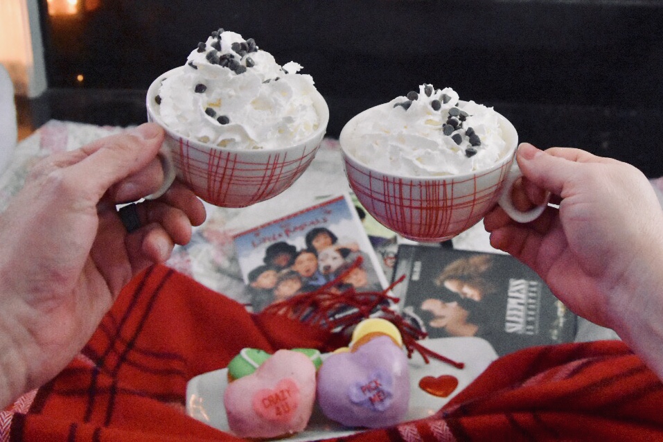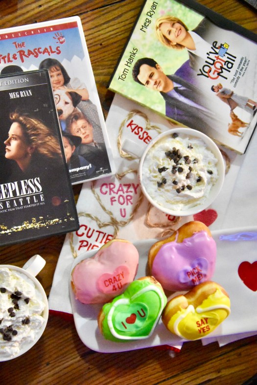 If you don’t have grandparents nearby to entertain the kids for a little bit, after supper send those kiddos toddling off to bed early, (they’ll get over it), dim the lights, light a few candles, grab a box of donuts, a couple of mugs of hot chocolate and your favorite cheesy rom-coms for a cozy night for two!