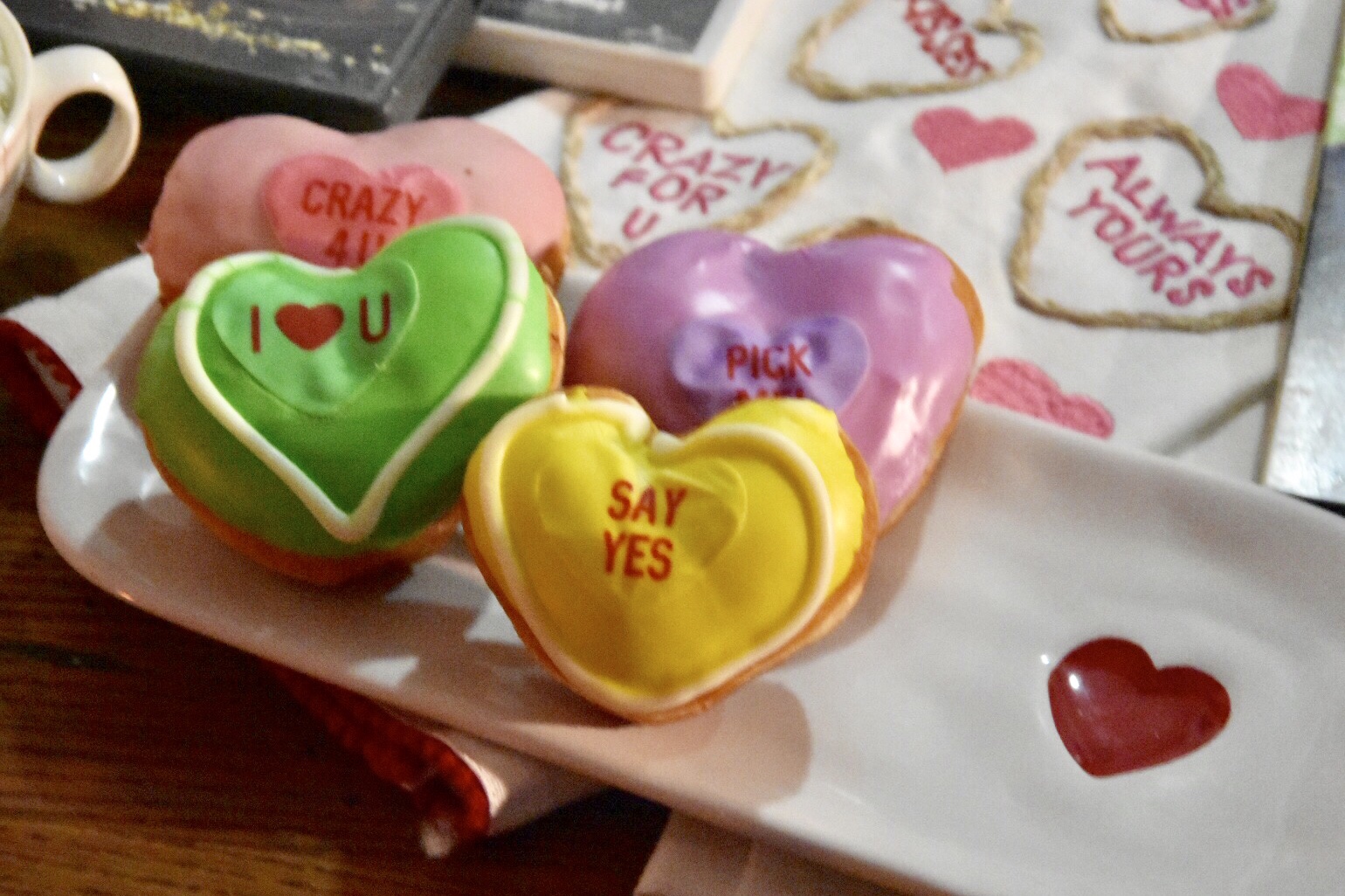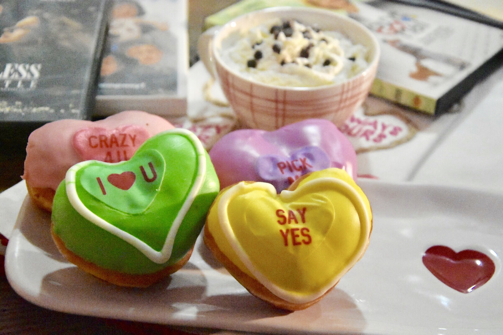 The cost of this date? If you make your hot chocolate from scratch and add whipped cream, around $25.00 (a dozen conversation heart donuts from Krispy Kreme is $10.99).
