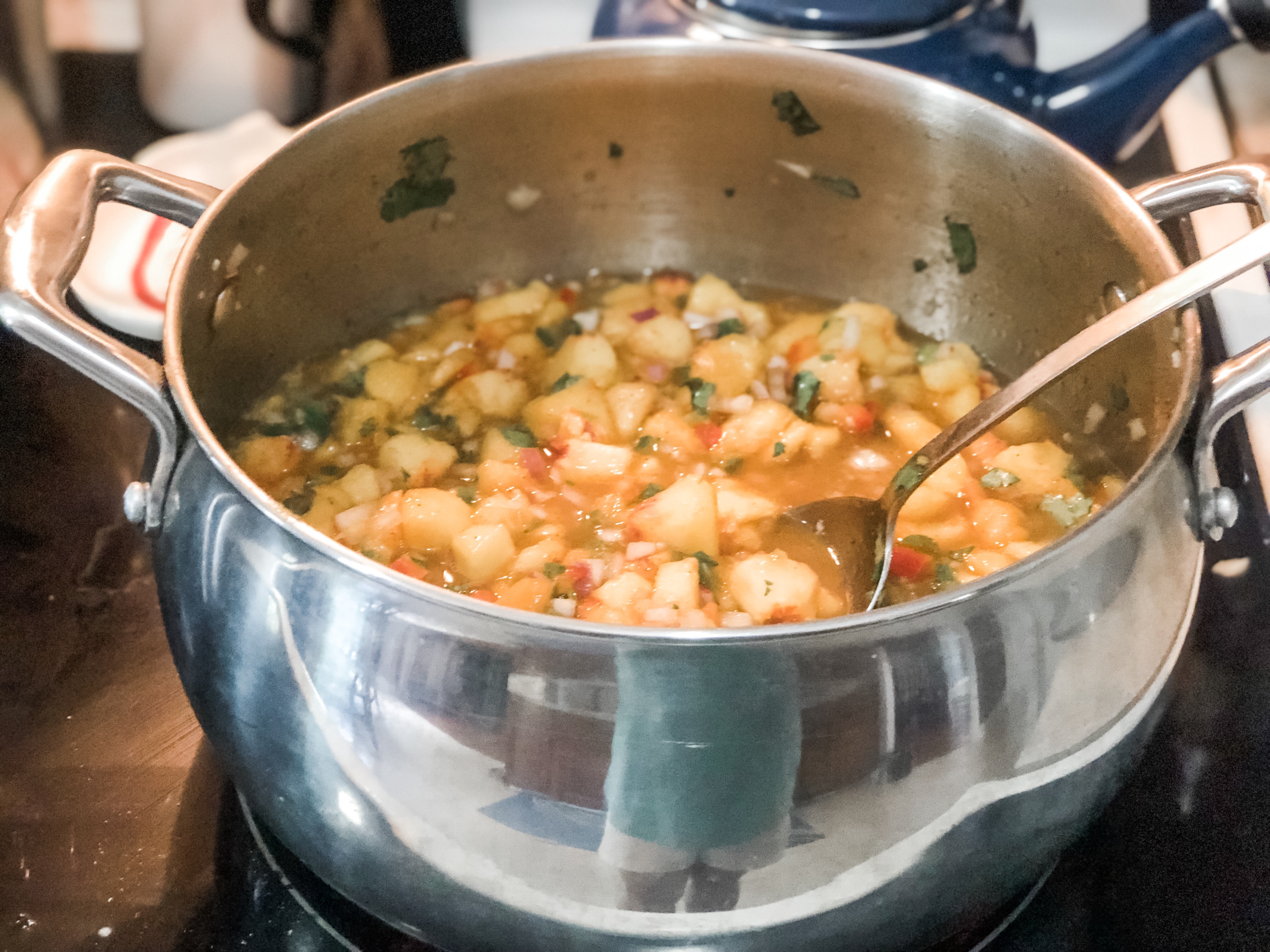 You’ll chop your peaches, dice your veggies and cook together until it comes to a boil.