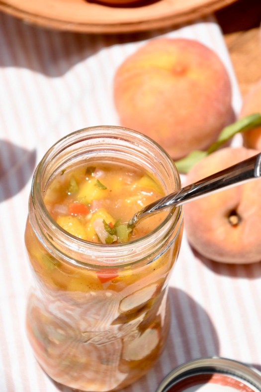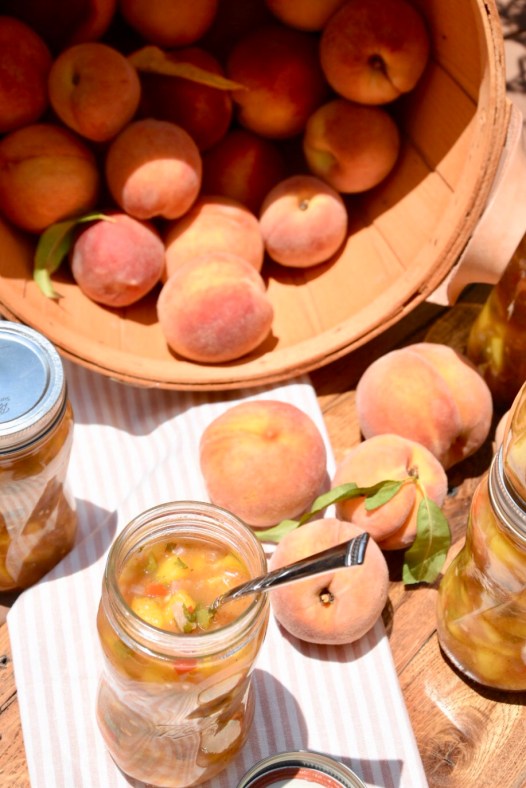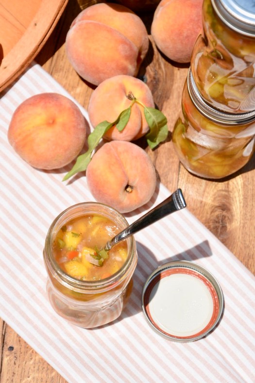 I love a good fruit salsa and peaches make one of the best! Not only is it delicious on tortilla chips like any good salsa, it makes a scrumptious accompaniment to grilled pork, chicken and fish! Then there is always the option of eating it straight from the jar like my son is prone to do.