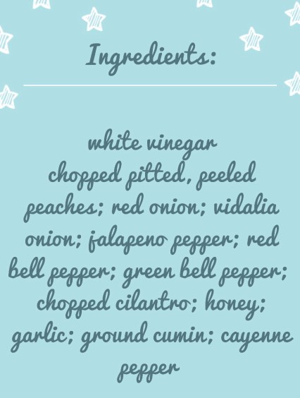 For this recipe all you need is peaches, red & green bell pepper, sweet and red onions, cilantro, jalapeños, garlic, cilantro, honey, vinegar, cumin and cayenne pepper. That’s it.