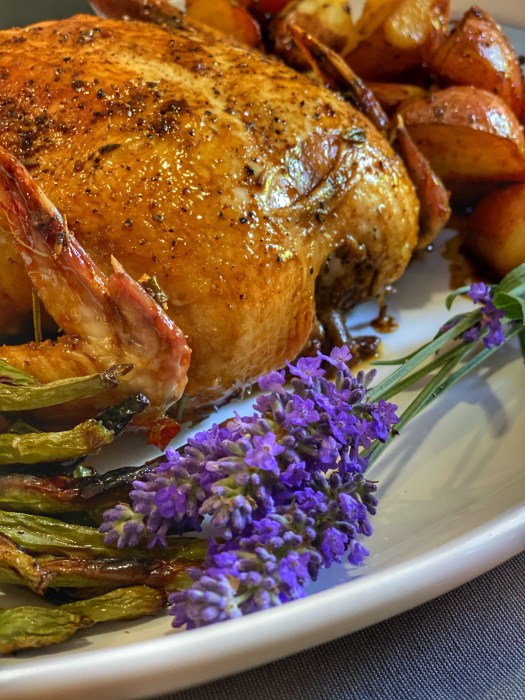 You will prepare your chicken using butter, salt and pepper, then begin roasting in the oven at 375°. You’ll mix your lavender honey glaze using the remaining ingredients on the stove top and about 20 minutes into roasting you’ll baste the bird every 5 minutes or so until it’s cooked through. A thermometer should be at 165° when inserted by the bone.