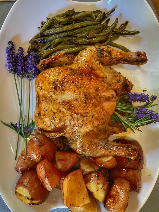 For the dish you need a whole chicken (local and fresh is best), butter, dried lavender flowers (in season right now, so try out drying your own), fresh thyme, fresh rosemary, local honey, and balsamic vinegar.