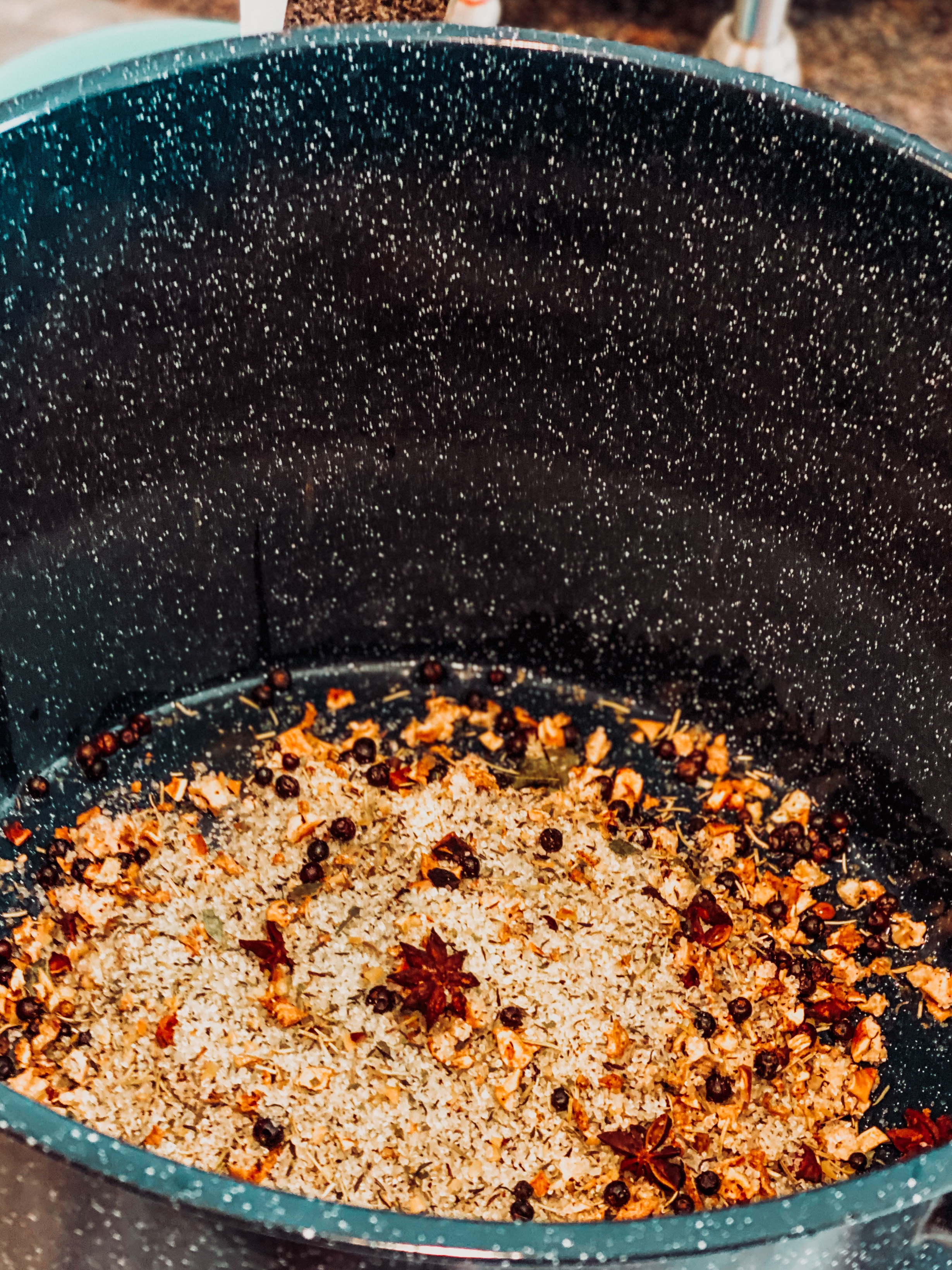 To brine the turkey I combine sea salt, brown sugar, juniper berries, star anise, lemon peel, orange peel, dried apple bits and other fresh herbs (I’ll post a link to print the full brine recipe below) with 2 1/2 gallons of water in a large non-reactive pan. Bring to boil, stirring occasionally, until the salt and sugar has dissolved. Let cool to room temperature, then refrigerate so that it is chilled. After the brining solution is chilled add your turkey, cover and refrigerate to soak for 24 hours.