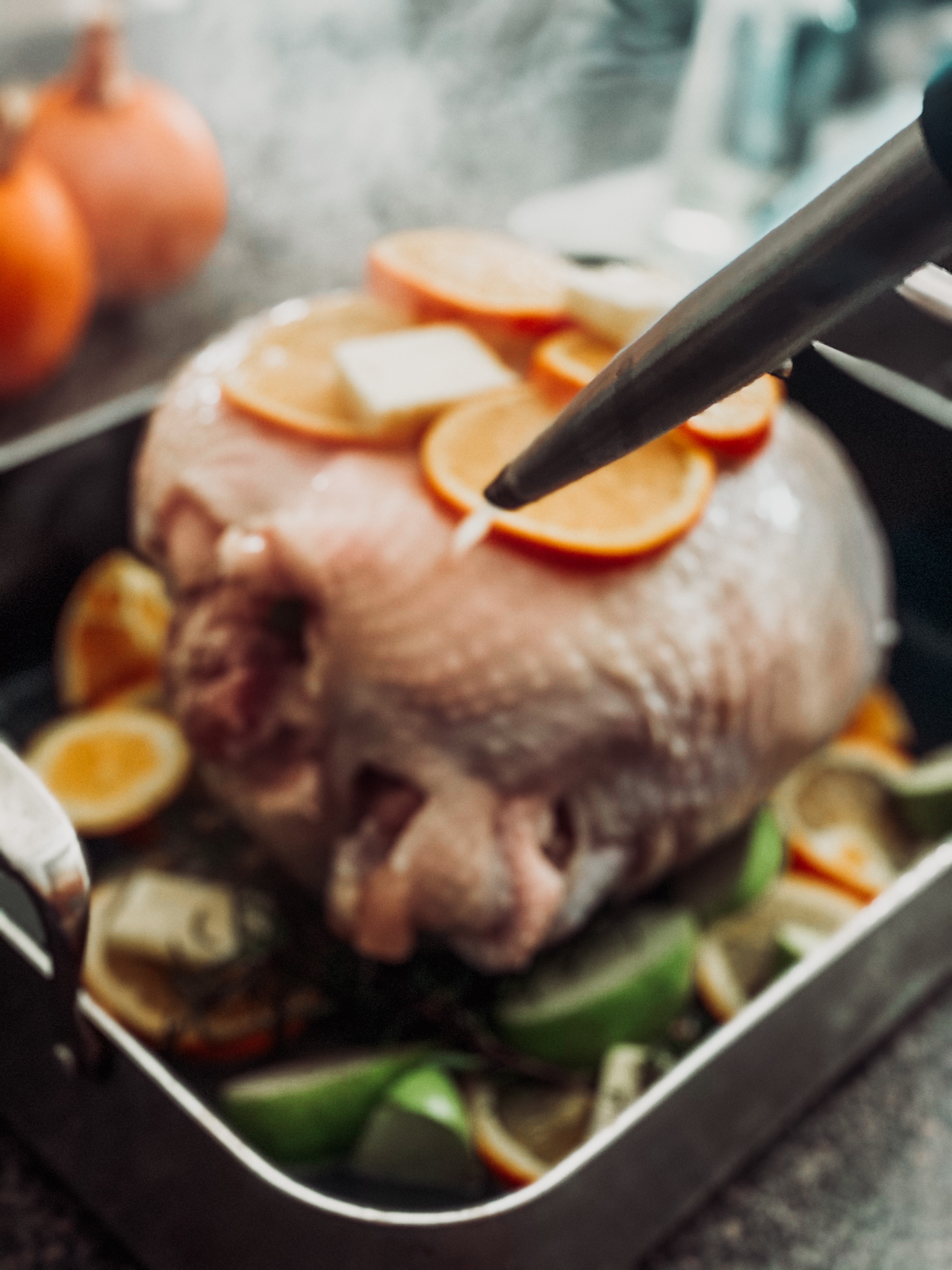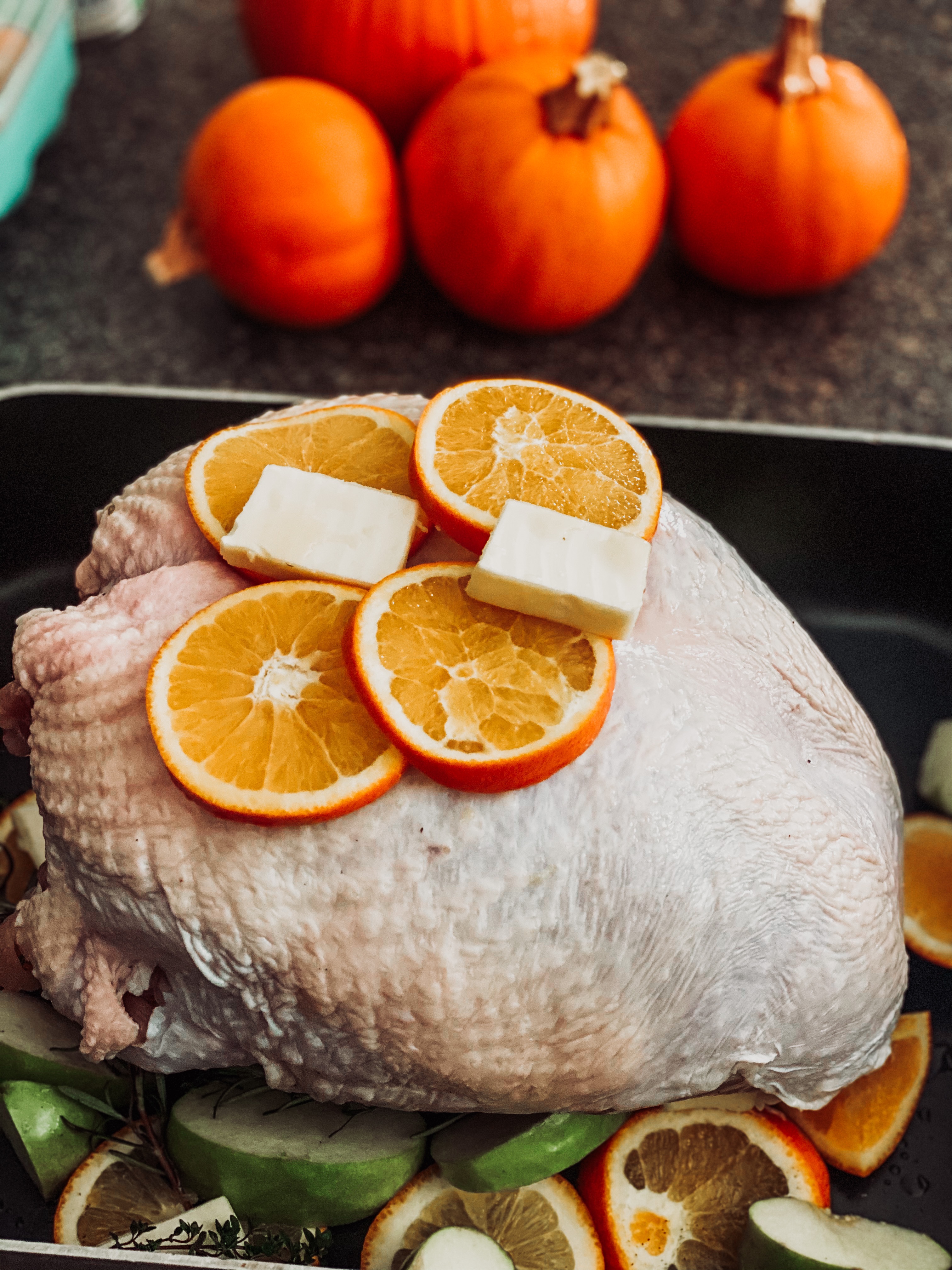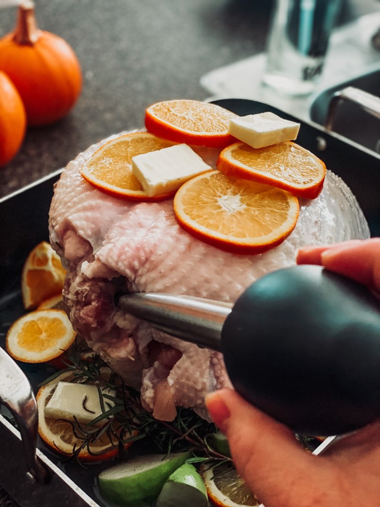 I roasted our bird by stuffing it with chopped apples, oranges and fresh rosemary and thyme from the garden, and placing it on a bed of the same ingredients. Since I was really looking for an orange flavor, a few well-placed orange slices between the skin and breast worked magnificently. Tent your turkey with foil and pop into the oven at 350 until the temperature reaches 160 degrees.