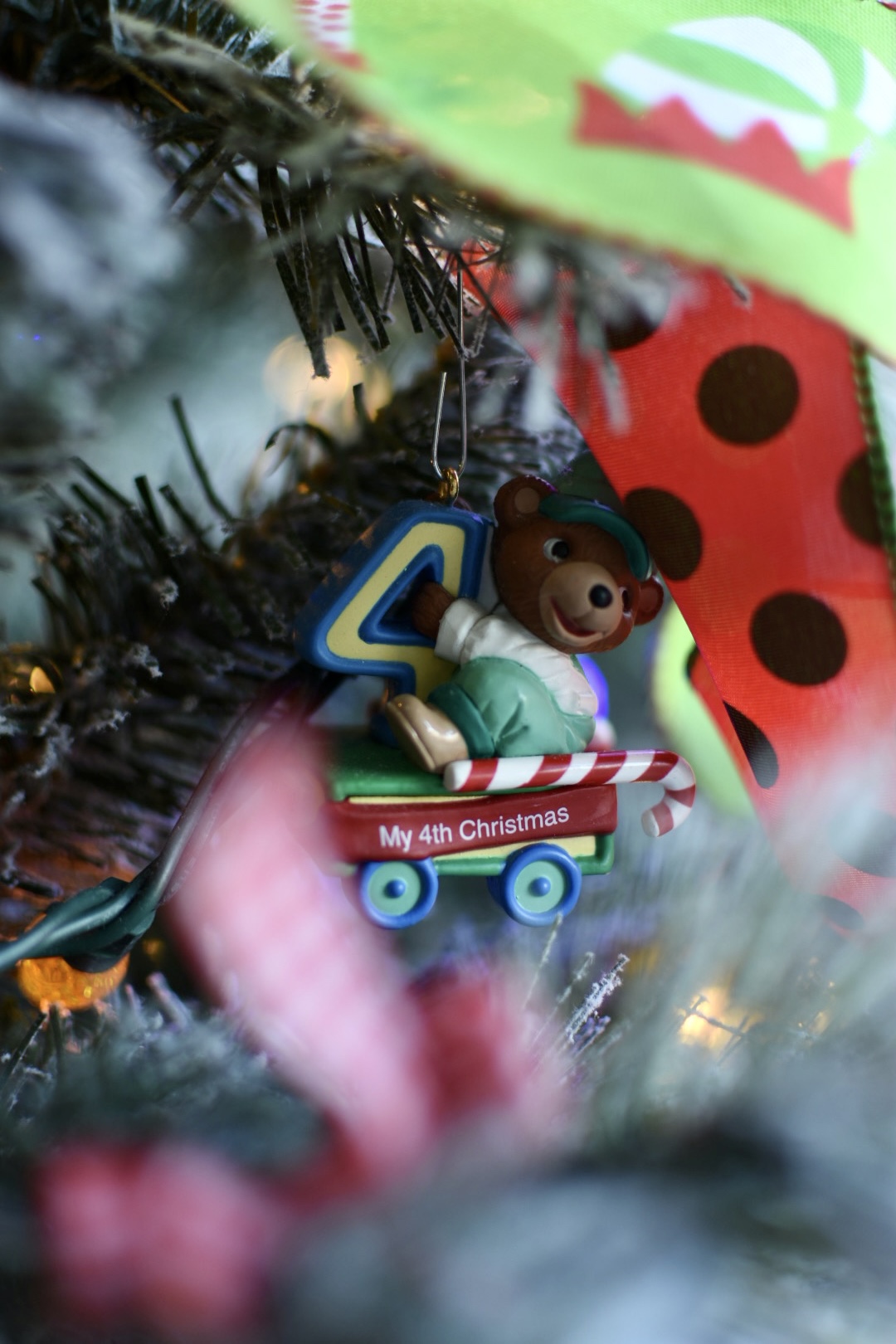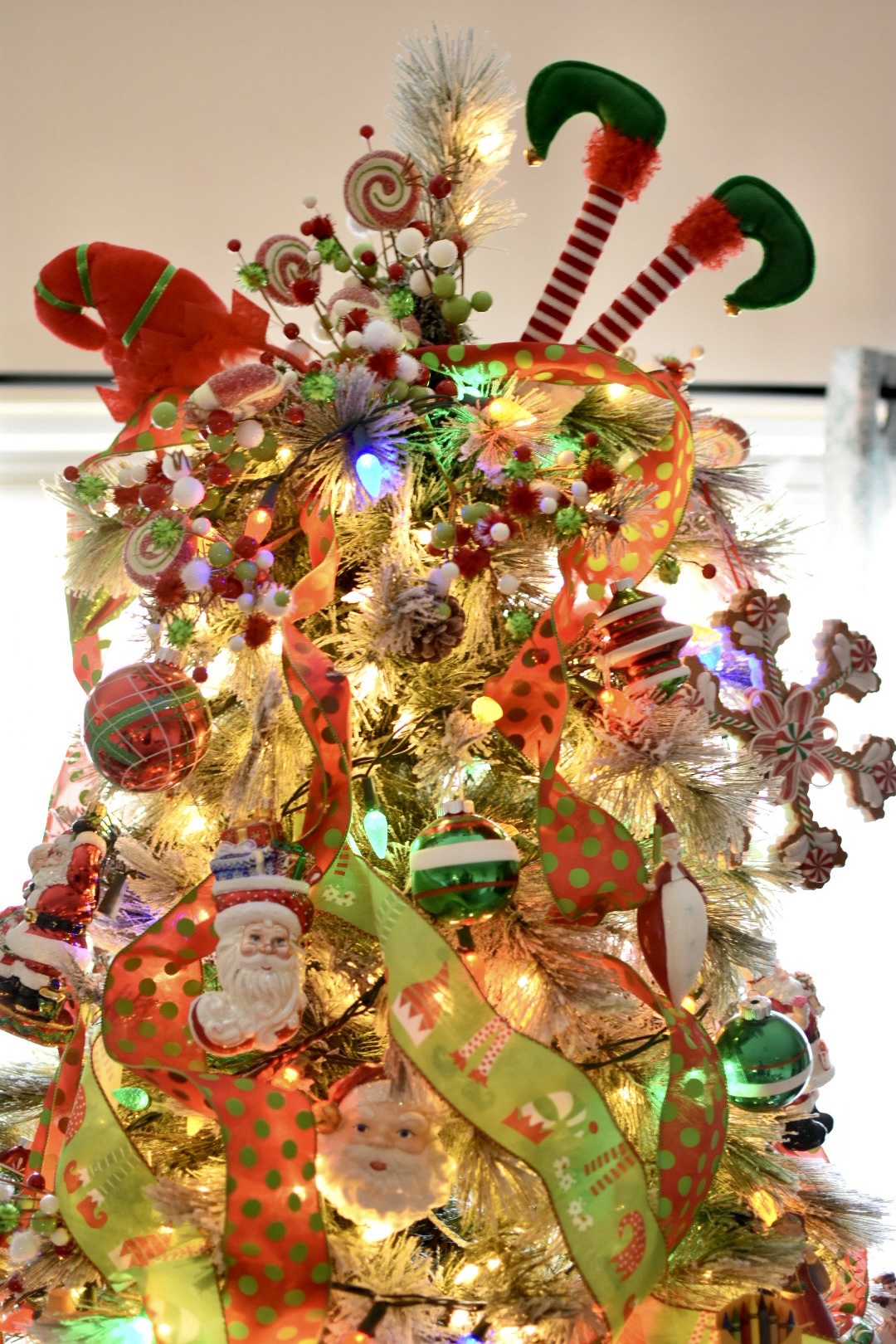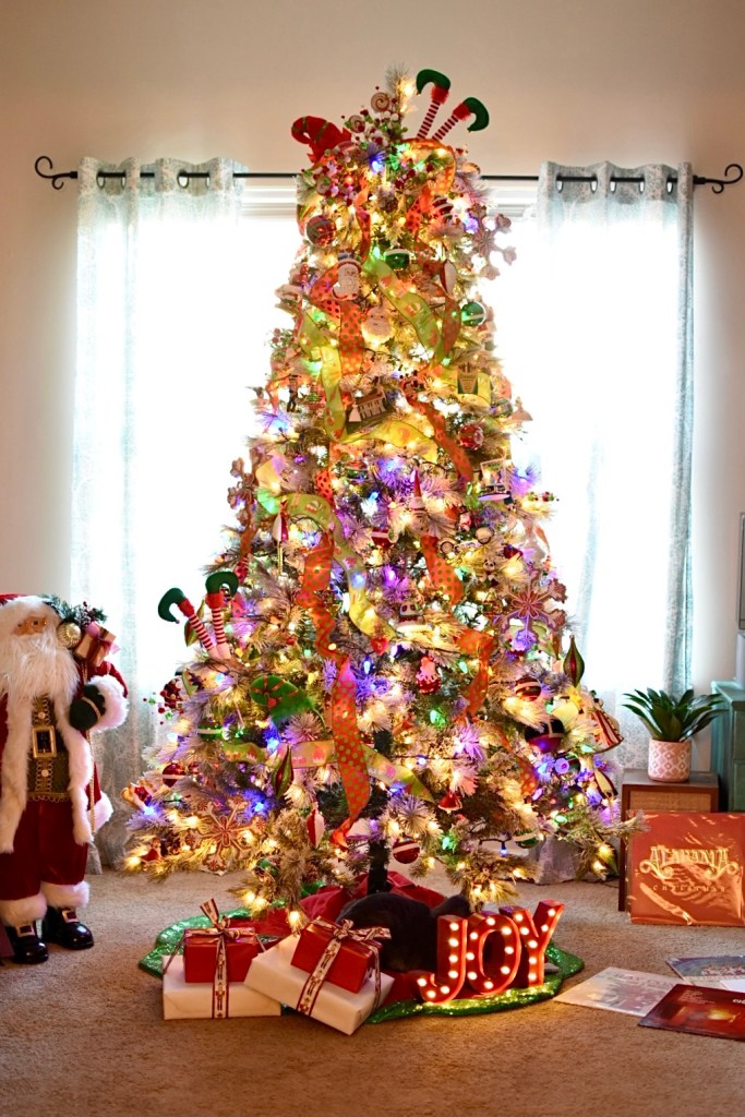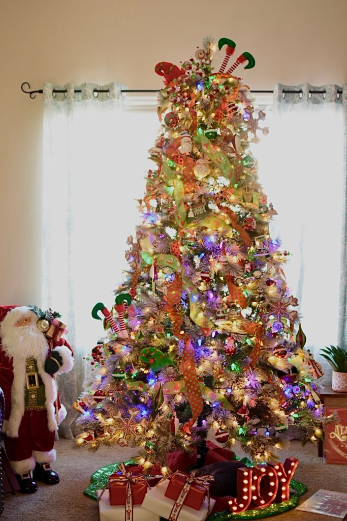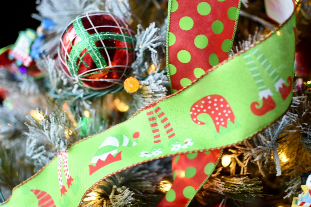 To pull everything together I found the wired green and red polka dot and the elf patterned ribbon on Amazon. The festive picks are from Hobby Lobby and the elf hats are actually cute holiday headbands. We added colored lights to our prelit tree to keep it playful and nostalgic. There is just something magical about brightly colored twinkle lights.