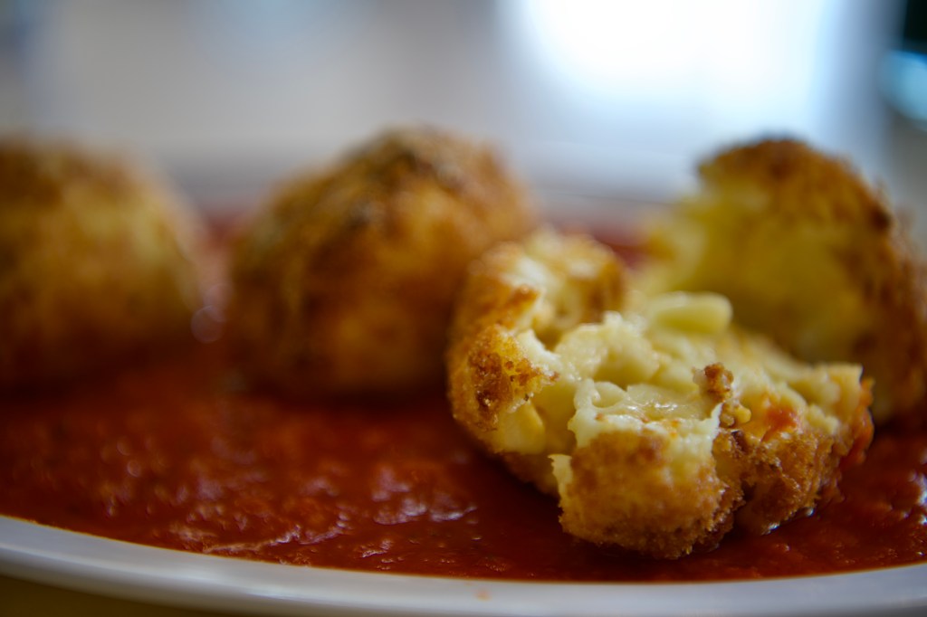 I told him I wasn’t sharing, but Audley grabbed a fork, cut into one of the mac balls and swiped it through the thick marinara sauce on the plate.