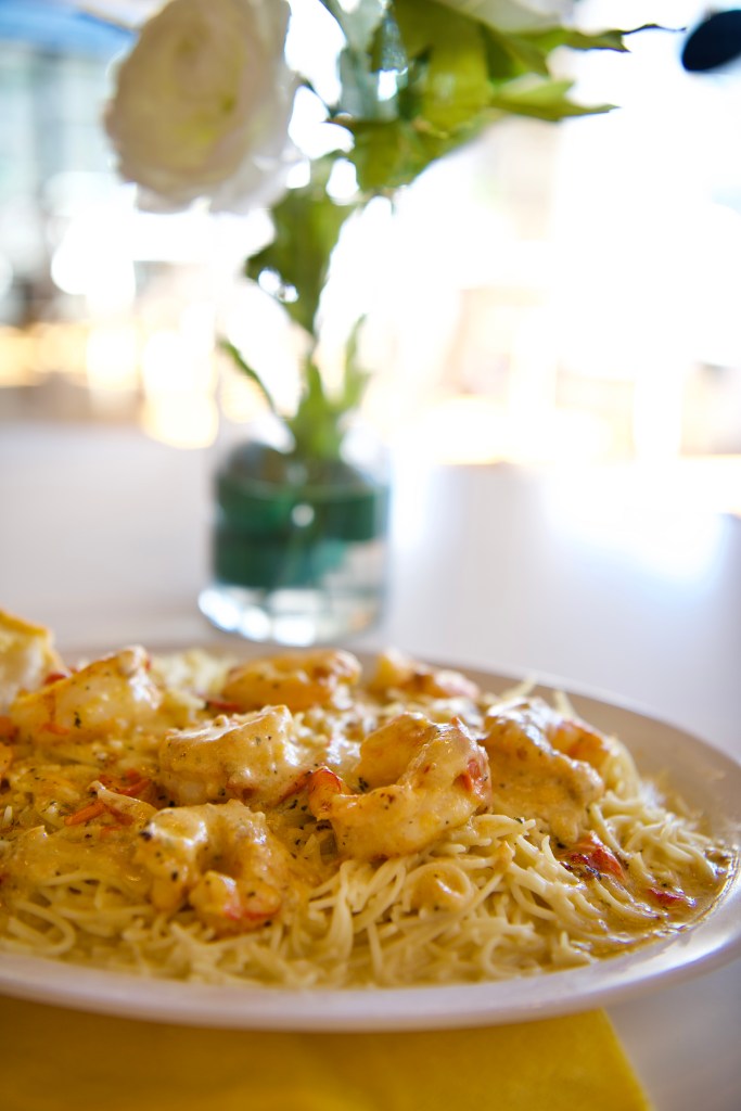 The shrimp scampi is made with pesto and feta pimento cheese (which is spectacular) with a creamy white wine garlic sauce on a bed of thin angel hair pasta. Audley needed a second, third and fourth taste to decide it really was quite delectable.
