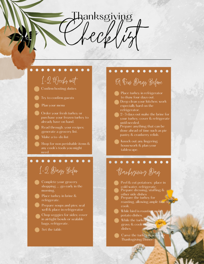 I don’t know about you, but any holiday having a timeline is a huge help for me. I begin light planning and prep at the beginning of November and have everything laid out in writing to get me through Thanksgiving. Some of the things included in my timeline is thawing time for the turkey (your own turkeys should be in the refrigerator by now), making the menu and grocery list, making sure you have proper cook’s tools to prepare everything, and details on when to begin preparing your foods.