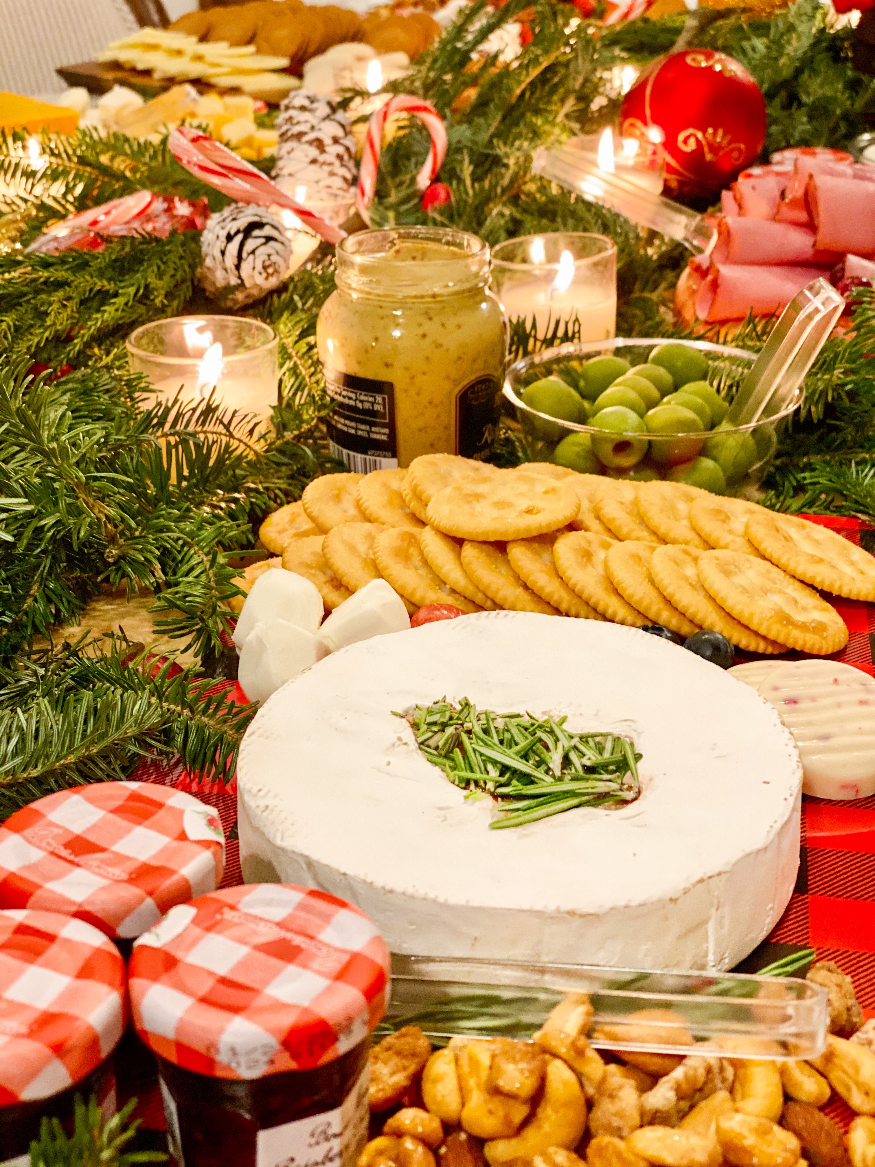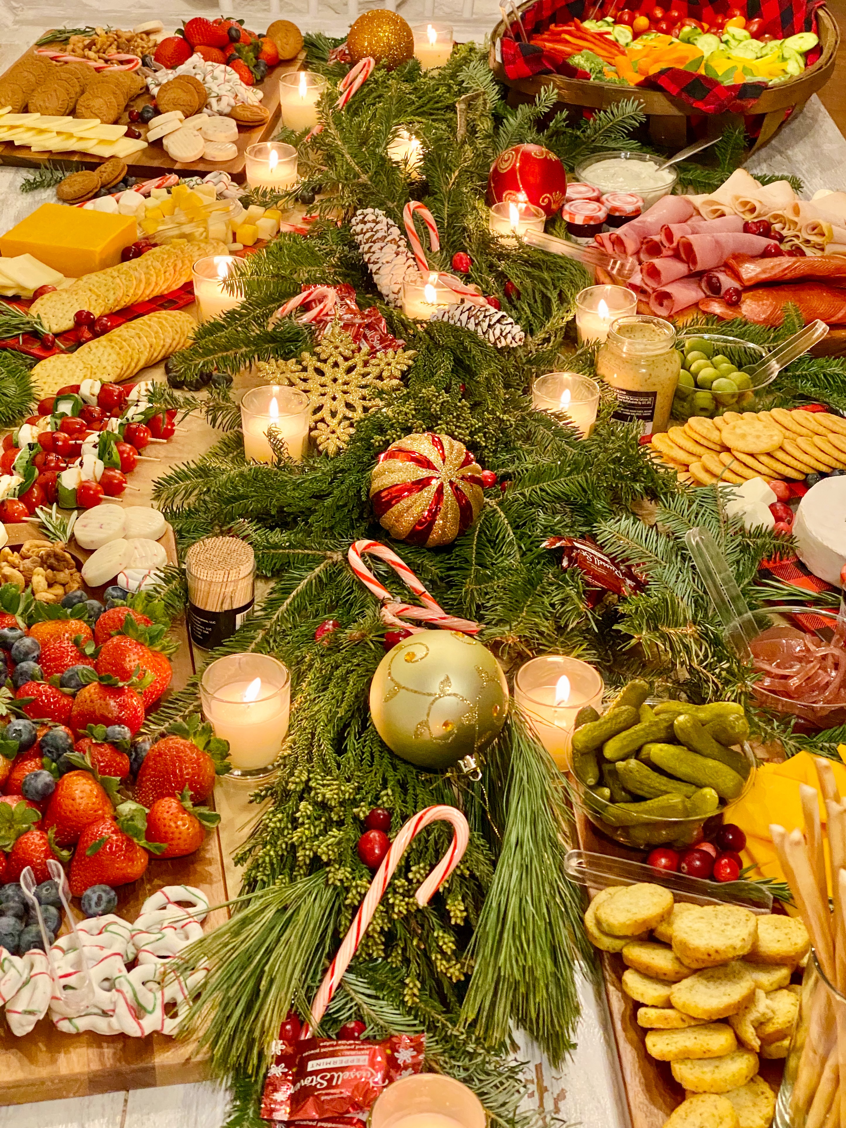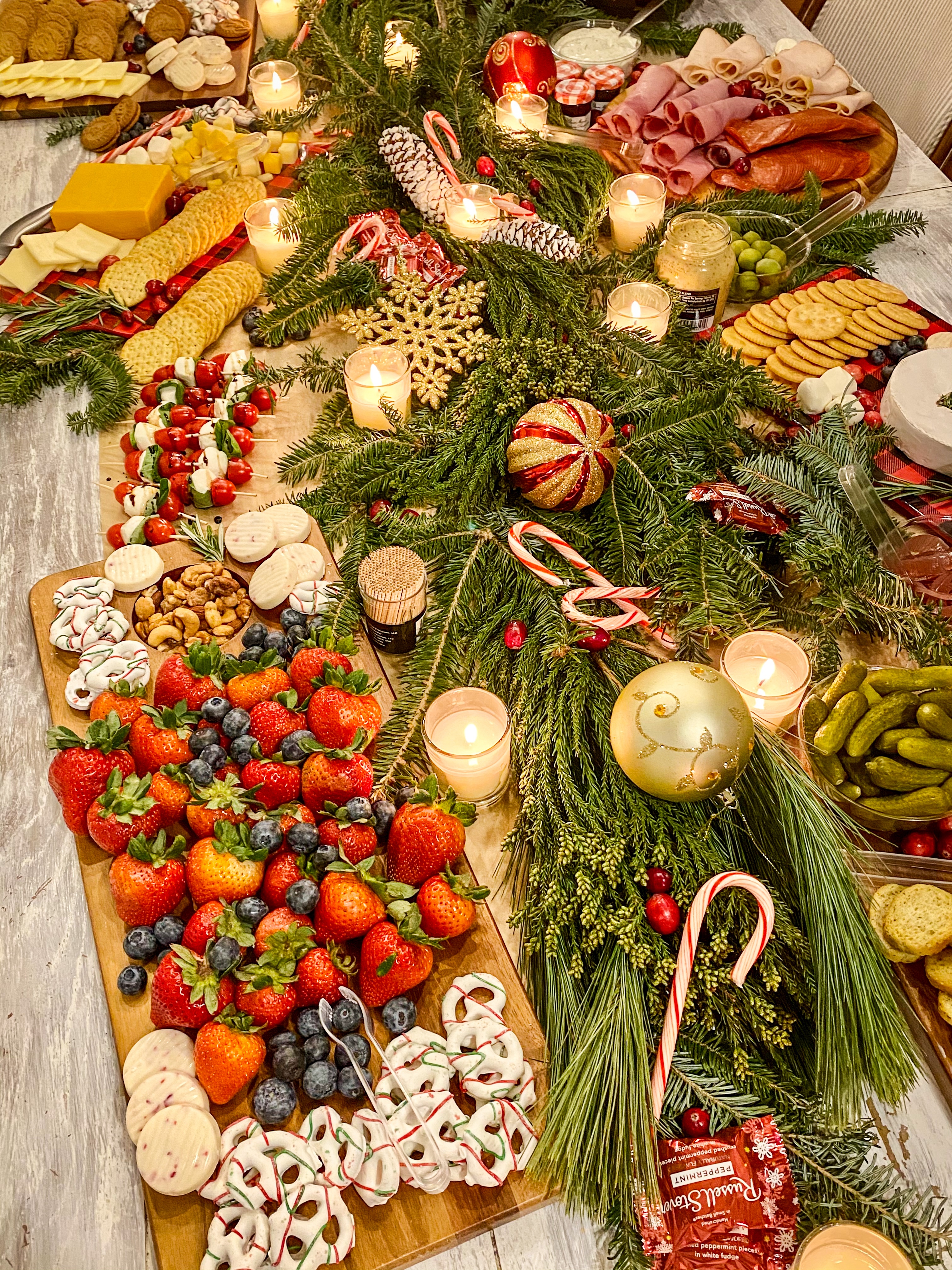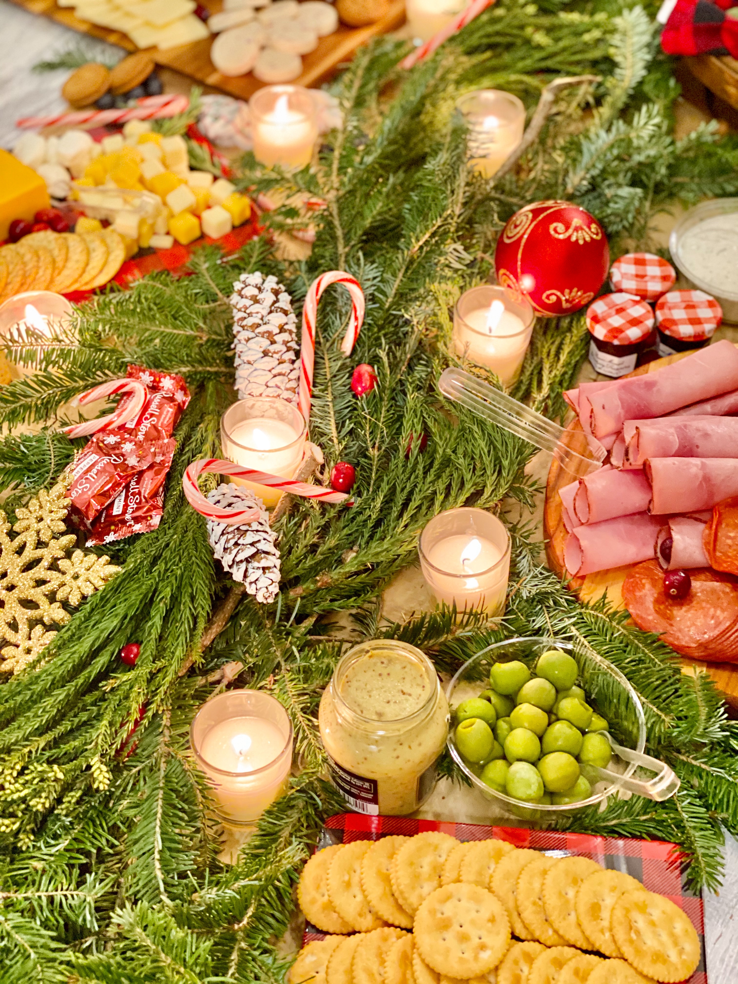 My centerpiece on this table was nothing more than washed, fresh greenery arranged down the center of the table with ornaments, candy canes, votive candles, and pinecones tucked in. I set the dishes on top and in the greenery but didn’t let it overpower the food. Normally I would add some height to my table, but this more rustic themed table fit well in the location of the girls night. I love using candles throughout our home, but especially on tabletops, so unscented votives are a must have on my list.