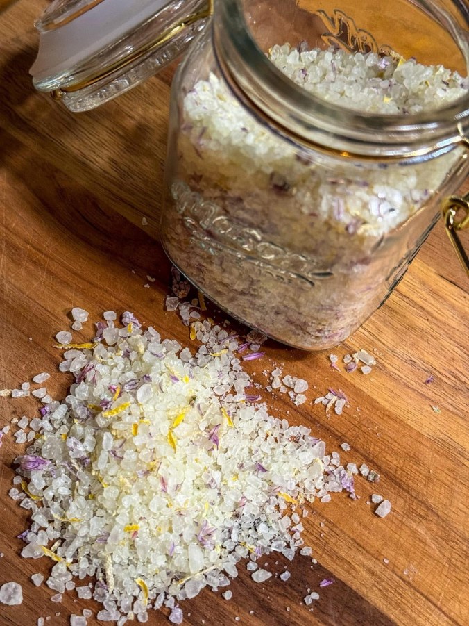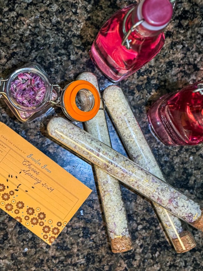 *Chive Blossom and Lemon Salt: My all-time favorite use for the blossoms is making seasoning or finishing salts. I dry chive blossoms, with lemon zest, and combine both with a blend of coarse and fine sea or kosher salts. This salt is a game-changer; delicious on roasted potatoes, grilled meats like pork, beef, or lamb, and in dressings. Plus, it looks stunning stored in glass jars, making it perfect for a hostess gift or simply admiring in your own kitchen. If you simply want to share a taste of the flavor in a gift basket, use a test tube for the salts, tied up with a pretty bow.