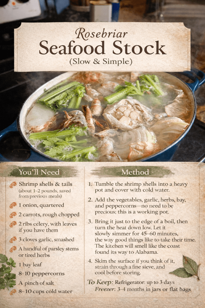On the stove there’s a container of seafood stock I made from shrimp shells I’d saved (from Gulf coast shrimp Audley picked up on his last trip to Florida for work), simmered with onions, celery, and a handful of tired herbs from the refrigeratior. It’s waiting patiently to become a pot of gumbo, one of our favorite winter delights.